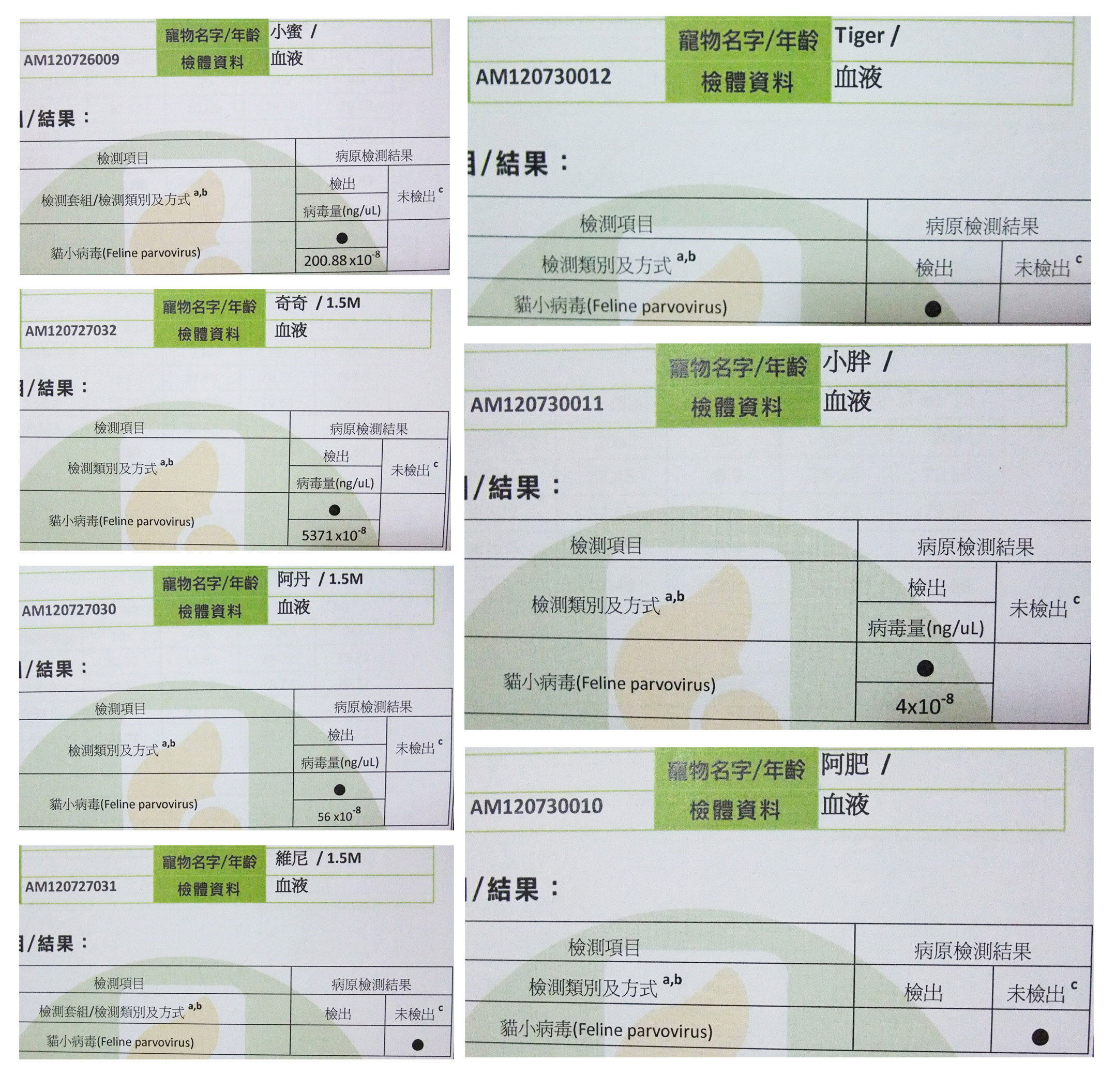 部份小貓未出現發病症狀,但血檢後發現,不是白血球標高,就是有貧血的現象,經台灣基因血液檢查確認,貓小病毒為陽性及微陽性,極少部份為陰性。