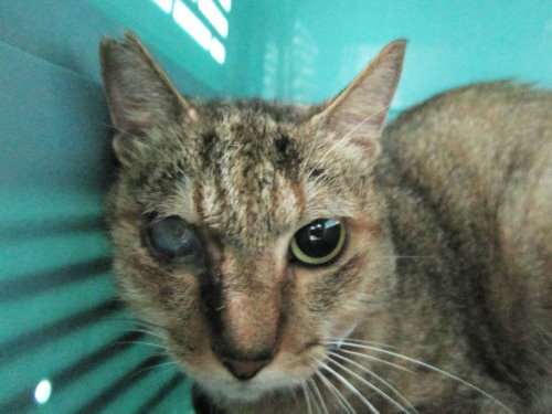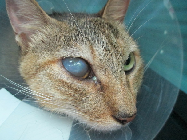 後續貓咪恢復狀況不佳,一直有小傷口未癒合,右眼本來一直呈現瞳孔放大的現象,後來開始出現分泌物,角膜螢光染色,發現其眼角膜有大面積潰瘍,眼睛超音波檢視眼球構造正常,先點眼藥水治療,三周後角膜螢光染色已恢復,再觀察卻發現眼睛中央出現不明液體,超音波檢視發現眼球已破損,視力已喪失,為避免二次性感染,只能摘除眼球,有可能是被狗攻擊後造成的傷害,時間一久問題就不斷顯現,目前貓咪恢復狀況良好,醫療費用麻煩各位的幫忙。