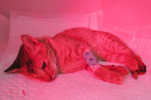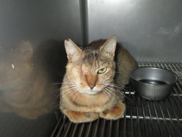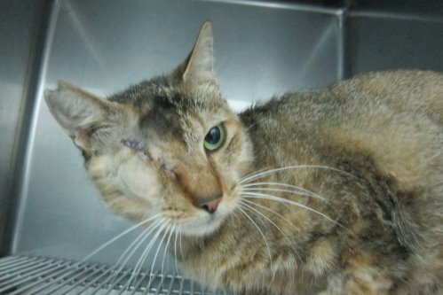 慈惠堂後門民宅附近發現的母貓,據發現的太太說,貓咪正在哺乳,小貓在屋頂夾縫,他是因為看見母貓傷口很深很大,帶來就醫,但是只能支付一千元費用,要求醫師縫一縫帶回去原地放,再多也無力負擔,但母貓的傷口很深,貿然縫合有可能內部會繼續潰爛,血檢後白血球過貓先施打抗生素,三天後手術縫合側腹的傷口,傷口很深只有薄薄的一層肌肉就到腹腔,因考慮貓咪身體虛弱先手術清創縫合沒有馬上結紮和縫合疝氣,調養4周狀況穩定已手術結紮並縫合疝氣,目前狀況良好,預計本周六出院,原本發現的太太支付1千元醫療費,其餘費用還請各位幫忙
