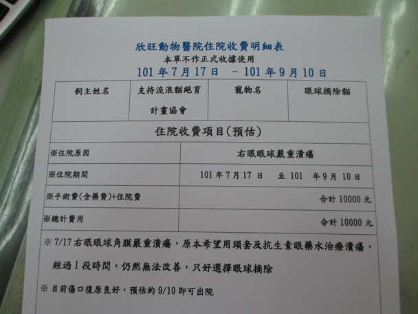 主題: 眼球破裂的虎斑 申請者姓名: 蔡葦澄 花色: 申請日期: 2012-09-11 00:15:02 申請者部落格: 申請者臉書網址: 所在縣市/合作醫院: 台北市/欣旺動物醫院 治療費用: 10000元 需求人數: 23人 已結案 (2013-06-15 11:27:18) 報名人員: Kay Fu(已付款)、Satine Yang(已付款)、Satine Yang(已付款)、王駝(已付款)、陳妍蓁(已付款)、陳妍蓁(已付款)、Hedy(已付款)、蘇小吉(已付款)、Sophie Chu、Sophie Chu(已付款)、Angel Tao(已付款)、王雅杏(已付款)、josephine Tai(已付款)、Denise(已付款)、阿蓋 (已付款)、Alison Lee(已付款)、clement(已付款)、籤籤(已付款)、yushi0304(已付款)、Peggy Lin(已付款)、Sunny Sun(已付款)、chiawei(已付款)、賴虹方(已付款)、Pan(已付款)、 候補人員: 小舟、小舟、小舟、小舟、惠雯、 動物病情說明: 原醫助編號609