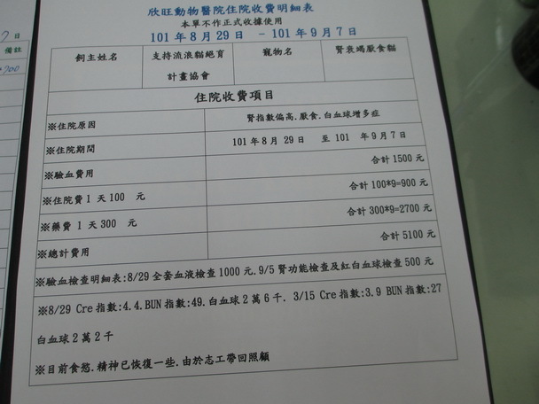 主題: 路倒嚴重脫水貓 申請者姓名: 蔡秀慧 花色: 申請日期: 2012-09-11 21:12:41 申請者部落格: 申請者臉書網址: 所在縣市/合作醫院: 台北市/欣旺動物醫院 治療費用: 5100元 需求人數: 13人 已結案 (2012-12-08 19:25:30) 報名人員: 米小恩(已付款)、Katilin Chang(已付款)、陳妍蓁(已付款)、philip(已付款)、philip(已付款)、中彰(已付款)、Hui Hui Ting(已付款)、Hui Hui Ting(已付款)、Tiffany Chung(已付款)、dplantis(已付款)、蕭淑慧(已付款)、蕭淑慧、Nancy(已付款)、蕭淑慧(已付款)、 候補人員: 動物病情說明: 紅鼻子是慈祐里志工的餵養街貓.不是每天遇的到貓.這天發現牠身上毛球糾結很嚴重.食慾不佳又爆瘦.所以只好誘補送醫.經血檢發現白血球過高.腎衰.不確定急性或慢性.經過治療1星期之後恢復食慾.腎指數有稍降.目前由志工帶回去照顧中.