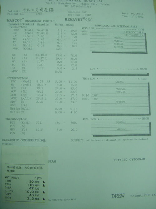 主題: 中和嚴重流涎的虎斑貓 申請者姓名: 蔡葦澄 花色: 申請日期: 2012-09-14 23:54:54 申請者部落格: 申請者臉書網址: 所在縣市/合作醫院: 台北市/恩加動物醫院 治療費用: 3000元 需求人數: 8人 已結案 (2012-12-08 19:24:26) 報名人員: Joyce Shih(已付款)、Bloomz(已付款)、永顗(已付款)、霆曌(已付款)、喜吱吱(已付款)、Lin Jo(已付款)、Lambme(已付款)、hungers(已付款)、 候補人員: 小舟、小舟、小舟、 動物病情說明: 粉絲團上網友通報這隻貓,外觀毛髮很糟、不太能進食、舌頭可能有傷腫脹流口水,當天貓咪沒有出現,隔天順利捕抓,送至醫院流涎嚴重,貓咪很緊張無法進一步檢查只好先麻醉結紮、抽血、洗牙,所幸及早抓到,感染不嚴重,拔牙洗牙後上點滴兩天胃口恢復,每天都把乾飼料和罐罐吃完,貓咪的醫療費用還請大家幫忙。謝謝!