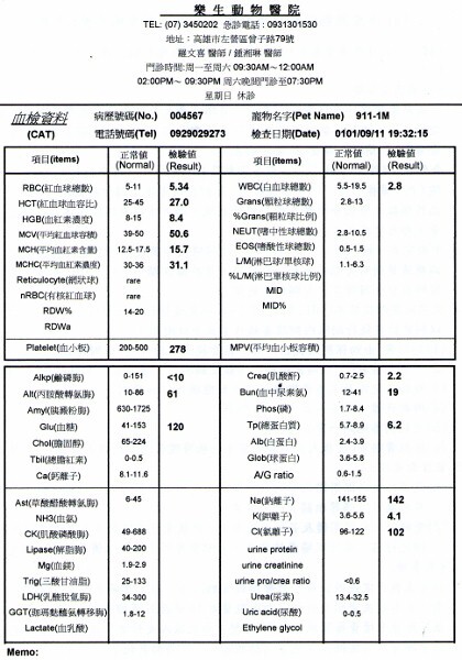 主題: 桂田街 眼睛感染 泌尿道有問題的橘公貓 申請者姓名: 劉雅雲 花色: 申請日期: 2012-09-18 22:30:52 申請者部落格: 申請者臉書網址: 所在縣市/合作醫院: 高雄市/樂生動物醫院 治療費用: 5700元 需求人數: 13人 已結案 (2013-06-27 13:38:03) 報名人員: 阮驛琇(已付款)、姚怡君(已付款)、瑄瑄(已付款)、Leah(已付款)、Pei Jing Gao(已付款)、李孟儒(已付款)、王踢娜(已付款)、Rong Chen(已付款)、Rong Chen、Ginny Cat(已付款)、dowdot(已付款)、KiKi(已付款)、Wen Lin(已付款)、Wen Lin(已付款)、 候補人員: 動物病情說明: 桂田街已經結過紮的橘白公貓, 三年前結紮後跟他的夥伴們在這邊定點餵養, 日前發現眼睛感染越來越嚴重, 又一直有蹲著尿尿的動作, 好像尿不太出來, 很常看到他在蹲, 懷疑有尿道結石或感染的問題. 醫生幫他驗血看有無感染現象, 還有X光照看看有沒有結石, 住院打點滴促進排尿並觀察. 檢查時發現有口腔問題並幫他拔牙與洗牙, 還好沒有尿道結石的問題, 目前治療後眼睛和排尿的狀況已改善, 目前放回原地, 持續餵藥一週和滴眼藥水.