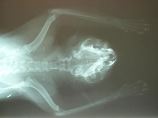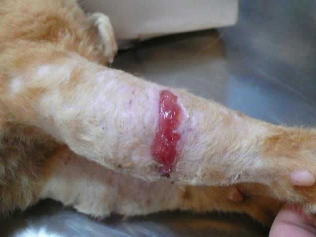 沒想到,我看到鐵沙掌的兩隻前腳上肢,不僅傷口腫大,遭利刃割傷,傷口平整,血似乎是乾掉了.於是我趕緊到附近醫院借了誘捕籠抓牠.還好牠沒跑遠,讓我順利抓到.我立即帶牠去長沁就醫.張醫師先為牠照了X光,確認腳沒斷,便趕緊清創.