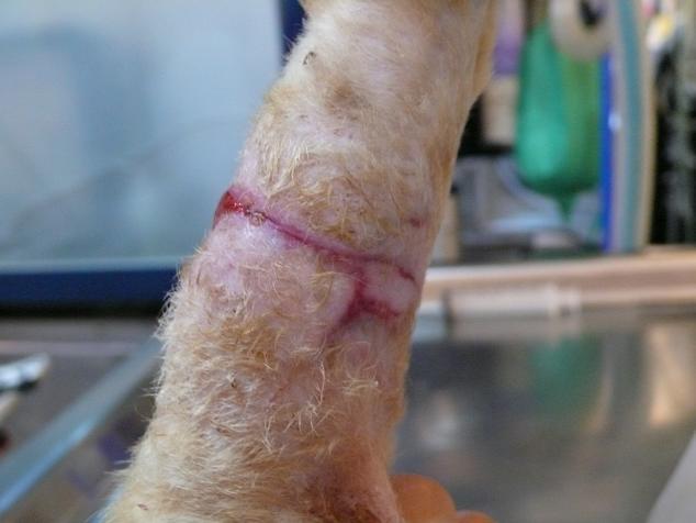 由於傷口面積都是橫切,而且傷口很大,因此無法動手術,只能等到傷口慢慢復原.也因為鐵沙掌會緊張,所以兩三天將牠麻醉後換藥.