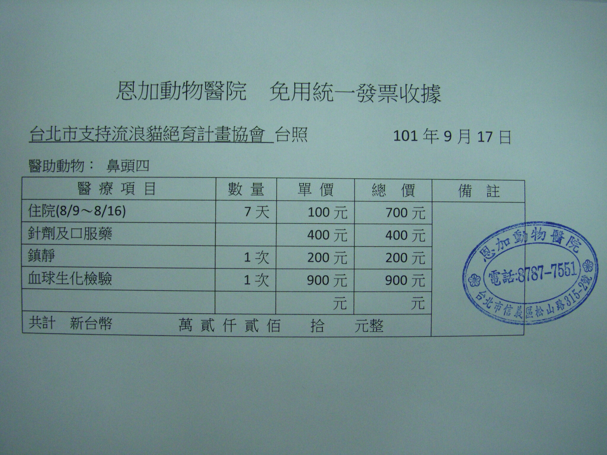 主題: 鼻頭四 申請者姓名: 敏大哥 花色: 申請日期: 2012-09-20 19:07:49 申請者部落格: 申請者臉書網址: 所在縣市/合作醫院: 台北市/恩加動物醫院 治療費用: 2200元 需求人數: 6人 已結案 (2013-06-27 13:37:18) 報名人員: Summer(已付款)、謝佩芳(已付款)、謝佩芳(已付款)、Nonie Huang(已付款)、Nonie Huang(已付款)、Nonie Huang(已付款)、 候補人員: 動物病情說明: 6/28在萬華新和里捕捉結紮,被抓到收容所去,通知志工領回,發現頭部有許多外傷,因此帶去醫院治療,好在只是單純皮肉傷,一周就復原回家。