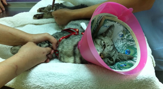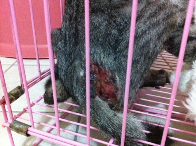 主題: 秀峰街車或皮膚臟器潰爛傷貓 申請者姓名: 張瓊安 花色: 申請日期: 2012-09-24 10:21:17 申請者部落格: 申請者臉書網址: 所在縣市/合作醫院: 台北市/長青動物醫院 治療費用: 4100元 需求人數: 11人 已結案 (2013-06-27 13:36:37) 報名人員: 橘喵(已付款)、Josesol(已付款)、阿吉(已付款)、Hsuan Yeh(已付款)、盧延毫(已付款)、Belen Chen(已付款)、Phoebe Lee(已付款)、Weili Chang(已付款)、Jenny Kao(已付款)、Jenny Kao(已付款)、Jenny Kao(已付款)、 候補人員: 動物病情說明: 101/9/17晚間有貓有向協會通報有傷貓在車下3天,後肢無法移動,只能靠前肢緩慢爬行,經民眾合力圍捕此傷貓由協會安排就醫,抓到的時候此貓極瘦,且非常餓,屁股有大片傷口已潰爛發臭、嚴重腹瀉、疑似因強烈撞擊(車禍)外觀內臟有疝氣移位,經超音波發現體內多處臟器有膿瘍,感染嚴重,後肢完全無神經反應且有萎縮情形,此貓應該受傷多日拖著劇痛在路上乞食,第一間醫院建議人道安樂,為了貓咪權益著想,經協會再安排至第2間醫院,醫生同樣建議安樂,請大家一同幫忙讓這隻可憐的貓咪一路好走。