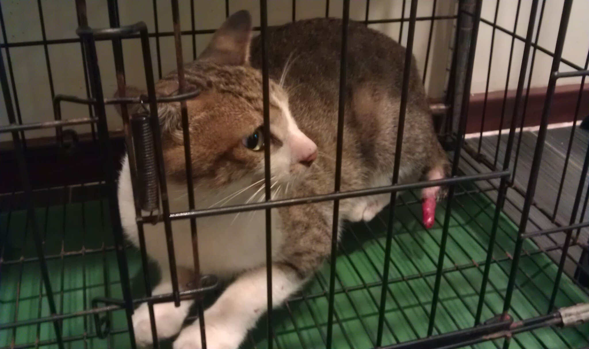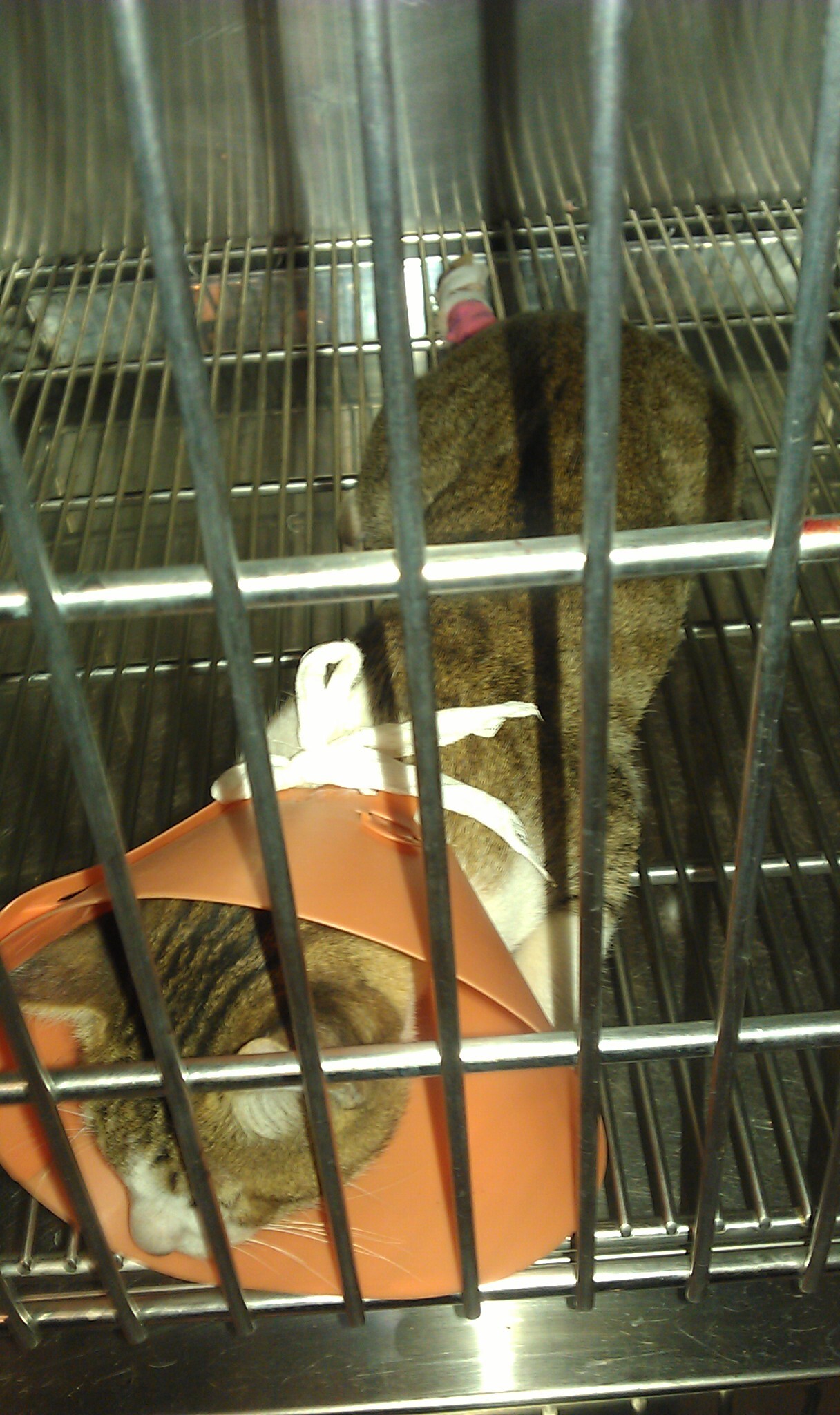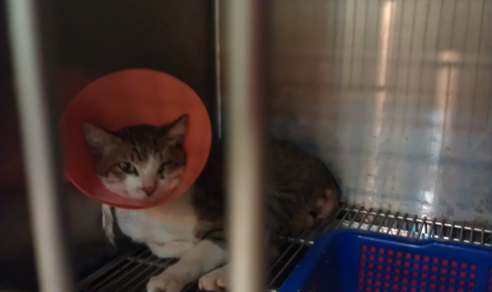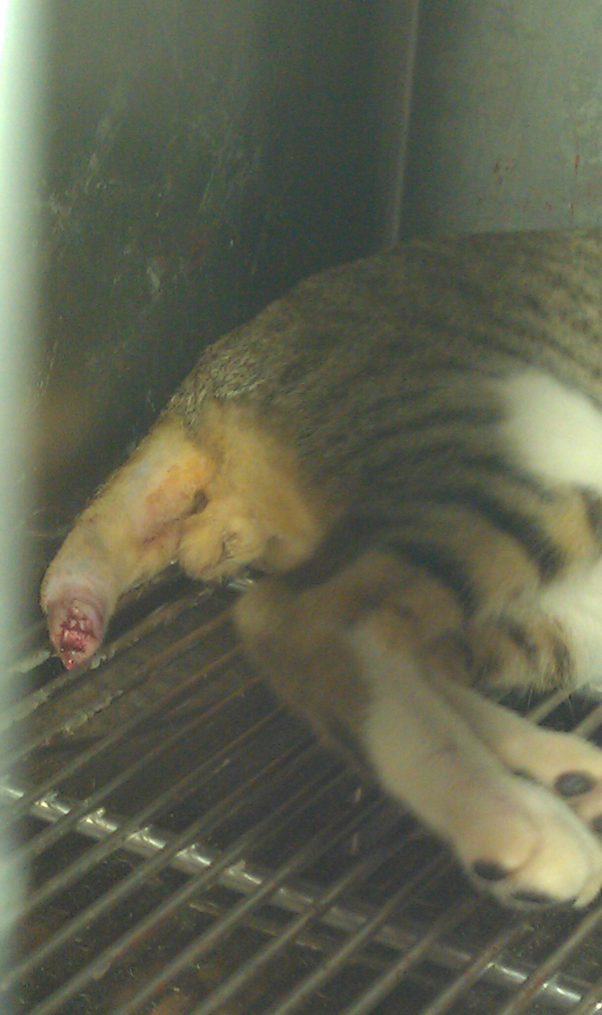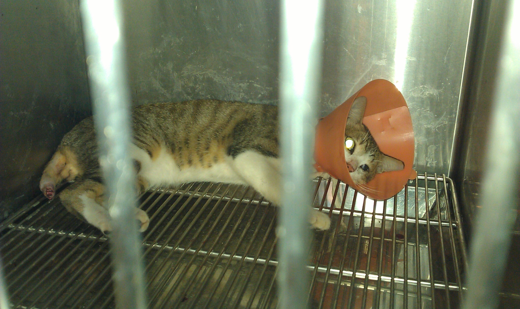 ㄚ花的尾巴,只要一動就會流血,誘捕籠裡也留下了血跡。檢查過後,ㄚ花尾巴的傷勢沒有嚴重到需要截尾,於是就先以包紮處理,一個星期之後又將ㄚ花鎮定檢查傷口,雖然傷口恢復的還不錯,但是因為ㄚ花在這期間非常的緊張,只要有人靠近他或者叫他,他就會害怕的發抖;考量ㄚ花的情緒、尾巴擺動的靈活度也較差、如果要讓尾巴慢慢復原恐怕需要較長的時間且每週檢查傷口都需要鎮定,所以還是決定做截尾手術。