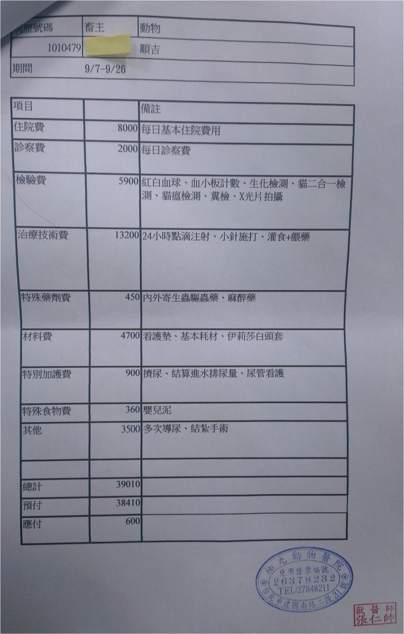主題: 收容所帶出癱軟路倒貓就醫 申請者姓名: 臺北市支持流浪貓絕育計劃協會 花色: 申請日期: 2012-10-09 00:09:51 申請者部落格: 申請者臉書網址: 所在縣市/合作醫院: 台北市/其他院所醫助專案(醫院請先MAIL溝通) 治療費用: 40000元 需求人數: 41人 已結案 (2013-06-27 13:42:50) 報名人員: 王璇華(已付款)、iMADOKA(已付款)、簡蜜歐(已付款)、馬睿妍(已付款)、Nikki(已付款)、Shizuka Ho(已付款)、維他(已付款)、Norman Wu(已付款)、流浪貓阿福(已付款)、朱朱大人(已付款)、陳布丁、陳布丁(已付款)、羅婉滋(已付款)、Penny Pan(已付款)、徐冠萱(已付款)、julie lee(已付款)、Xiao C Chen(已付款)、Katilin Chang(已付款)、陳布丁、Erin(已付款)、jimmy(已付款)、jimmy(已付款)、Sherry Fang(已付款)、Sherry Fang(已付款)、Sherry Fang(已付款)、徐阿悟(已付款)、Samuel Chu(已付款)、np0041(已付款)、Vio Chung(已付款)、流浪媽(已付款)、mitdo43(已付款)、潘逸群(已付款)、dplantis(已付款)、leonhon(已付款)、Eve Wang(已付款)、Eve Wang(已付款)、丁小丁(已付款)、Fg Jan(已付款)、chiawei(已付款)、貓寶貝(已付款)、莊慧妤(已付款)、Yu Ha(已付款)、Yu Ha(已付款)、 候補人員: 動物病情說明: 順吉是板收非官方粉絲團,