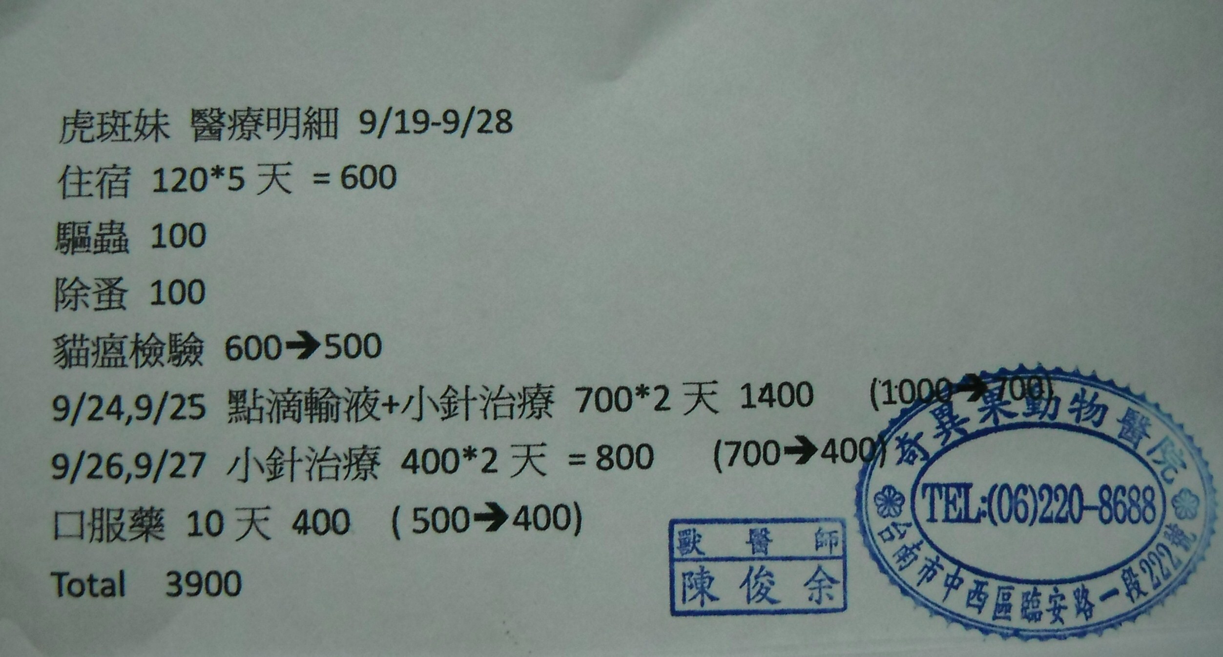 主題: TNR時T到的小虎斑 申請者姓名: 杜旻凌 花色: 申請日期: 2012-10-11 19:10:05 申請者部落格: 申請者臉書網址: 所在縣市/合作醫院: 台南市/奇異果動物醫院 治療費用: 3900元 需求人數: 9人 已結案 (2013-06-27 13:48:16) 報名人員: Cecilia Hsu(已付款)、Cecilia Hsu(已付款)、Sai Ren、Sai Ren(已付款)、nicole chen(已付款)、吳小賢(已付款)、kenlin(已付款)、lita(已付款)、davidlai(已付款)、小不點(已付款)、 候補人員: 動物病情說明: 在TNR時T到的小虎斑,住院隔離期間,出現了不吃、嘔吐、拉肚子的狀況,幸好貓溫過關,住院治療後已經出院,目前在家接受親人訓練,才能送養