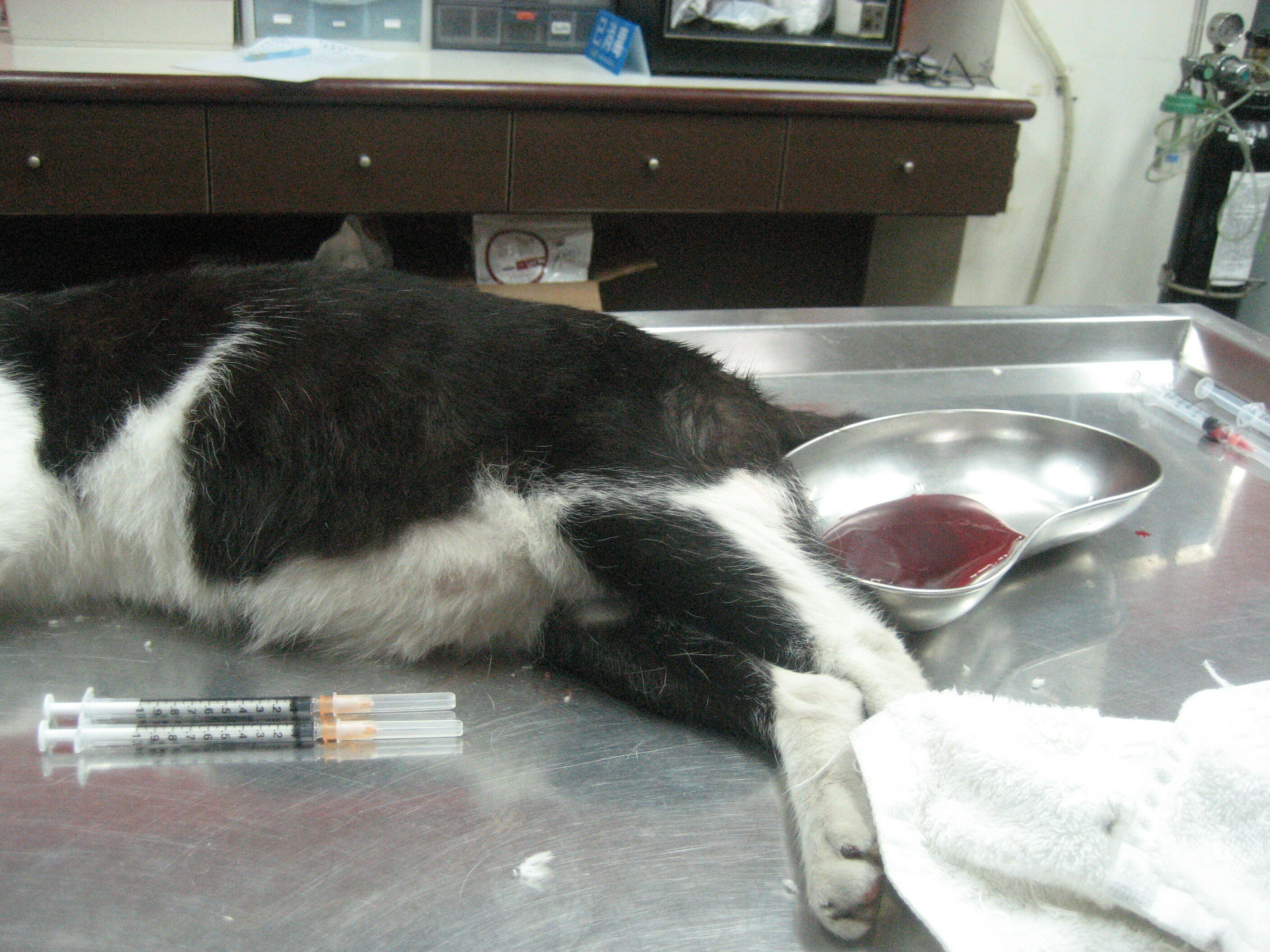 黑白大貓是流浪貓,因為誤食毒物中毒,嚴重傷害腎臟,造成血尿,腹水,經搶救治療無效,貓咪己死亡.(16000)