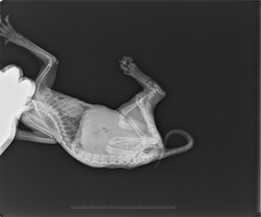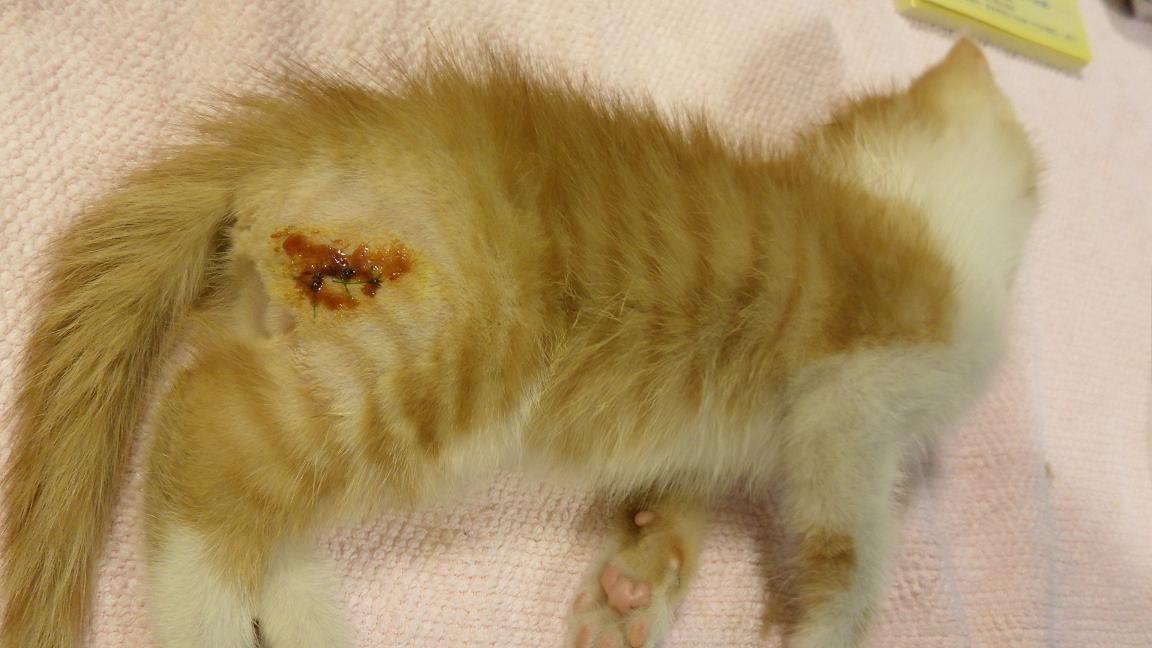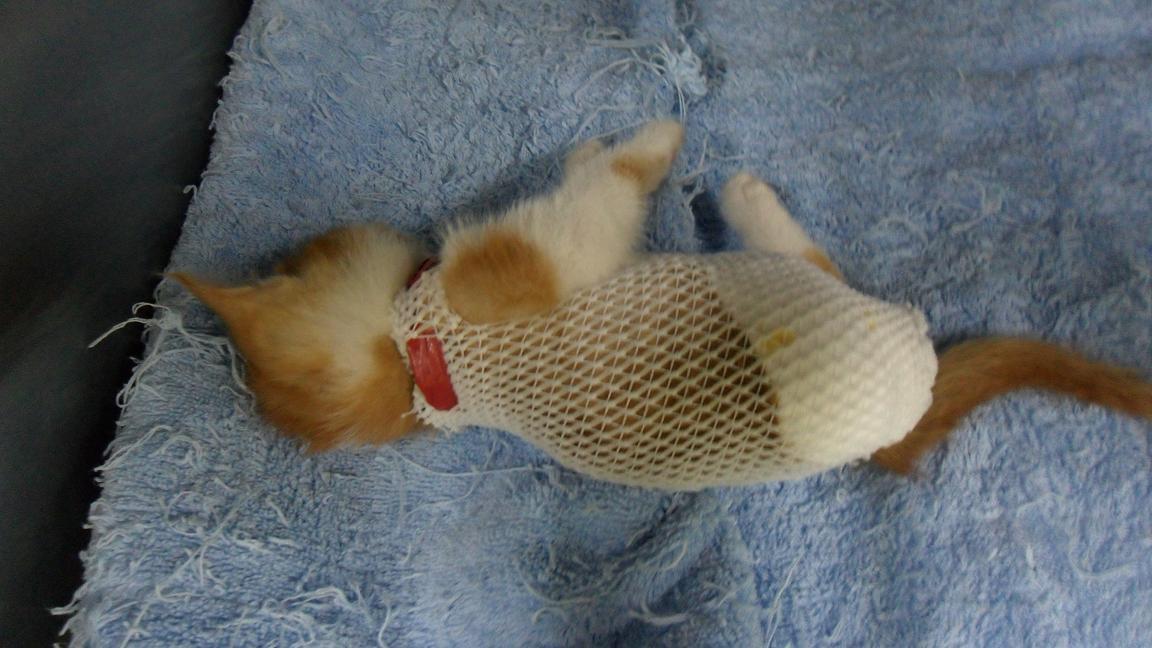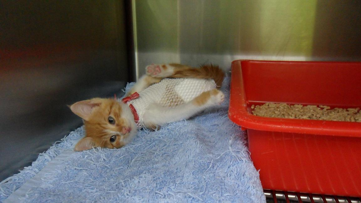 隔天早上送小貓醫院拍X光照確實有骨折也再右後腳大腿找到一個表面結痂腫脹的傷口但手一按下去膿立刻冒出來麻醉後把表皮結痂撕開露出一個不小的傷口清創縫合後住院一周觀察大腿骨折部分用彈性繃帶暫時固定住但需4~6周目前由我帶回照顧至骨折痊癒再開放認養