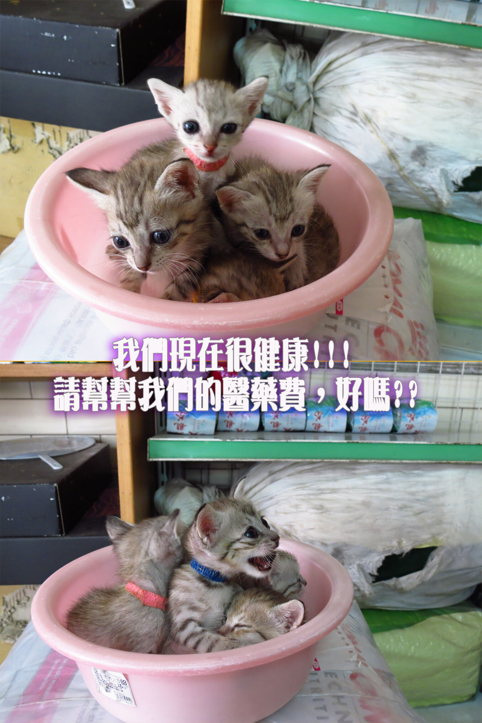 小喵們於10/4出院,目前頭好壯壯,會用貓砂吃雞肉泥拌乾乾粉;希望大家可以幫幫他們的醫藥費,幫忙減輕秀雲姐負擔,拜託拜託!!!