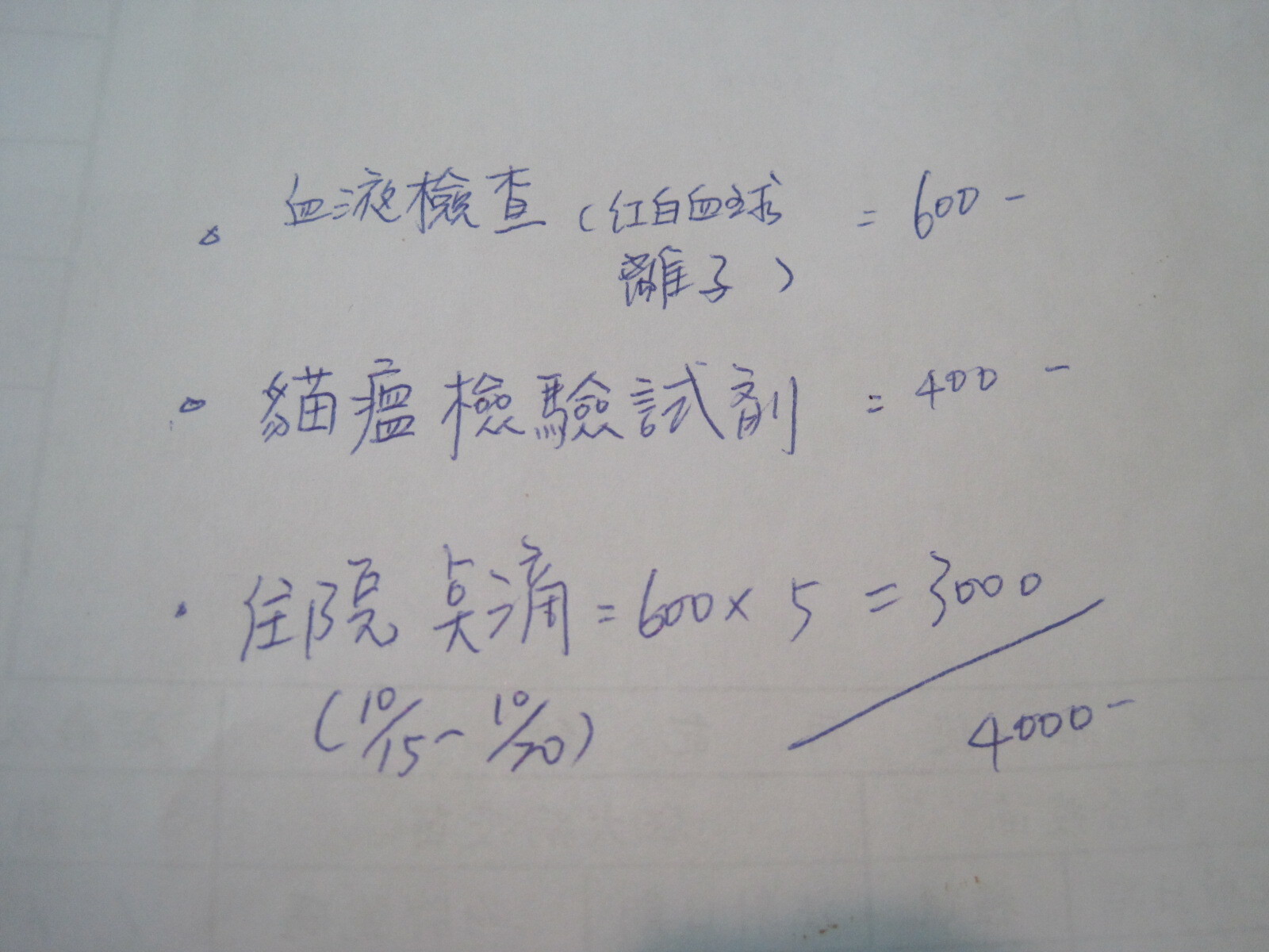 主題: 感染到貓瘟的玳瑁貓 申請者姓名: 岳丹楓 花色: 申請日期: 2012-10-21 12:11:46 申請者部落格: 申請者臉書網址: 所在縣市/合作醫院: 台北市/詠欣動物醫院 治療費用: 4000元 需求人數: 10人 已結案 (2013-06-27 13:53:01) 報名人員: Summer(已付款)、Summer(已付款)、Bei Bei Wang(已付款)、徐雅嬪(已付款)、天真(已付款)、Wenlin Hsiao(已付款)、常音(已付款)、林昱達(已付款)、火鳳貍(已付款)、火鳳貍(已付款)、 候補人員: 動物病情說明: 在10/12黎安里,抓到2隻貓咪結紮.虎斑公貓在結紮後1天半突然死亡,檢查發現有貓瘟感染.另一隻玳瑁母貓,也檢查出有貓瘟帶原,加上結紮換環境的壓力,3天後開始出現拉血便 精神很差的症狀.在醫治5天後仍不幸往生.