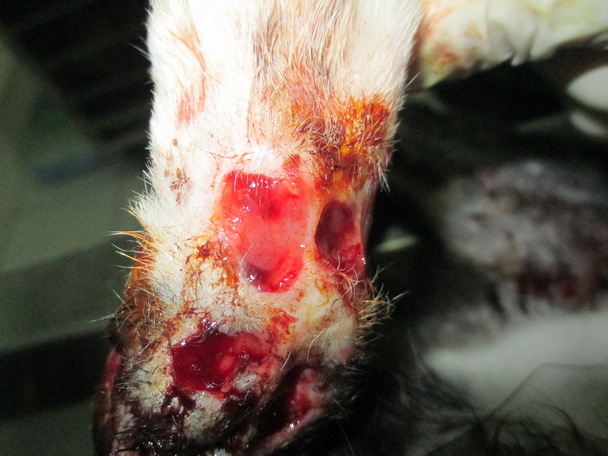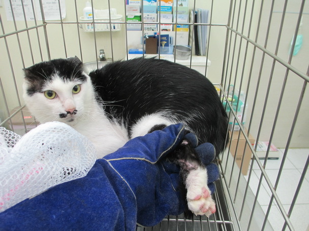 主題: 疑似車禍受傷又被大狗追咬的傷貓 申請者姓名: 詹惠文 花色: 申請日期: 2012-10-23 15:07:39 申請者部落格: 申請者臉書網址: 所在縣市/合作醫院: 台北市/欣旺動物醫院 治療費用: 20000元 需求人數: 22人 已結案 (2013-06-27 13:51:54) 報名人員: 收夕(已付款)、泰迪貓(已付款)、Arthur Jo(已付款)、chiawei(已付款)、Lulu Hsieh(已付款)、林宜屏(已付款)、Joyce(已付款)、林苡瀅(已付款)、鍾慶燁(已付款)、Yen Tzu(已付款)、Karen Chang、J2(已付款)、William Chang(已付款)、潘逸群(已付款)、潘逸群(已付款)、夏實舞(已付款)、周星星(已付款)、Shu-Ting Chuang(已付款)、Roxy Chen(已付款)、陳小茜(已付款)、S.Wish Kong(已付款)、春卷(已付款)、王千枝(已付款)、 候補人員: 動物病情說明: 黑白公貓為中山區行政里行天宮後面一位70歲愛媽呂媽媽餵養區的貓.呂媽媽表示有多週不見該貓出來覓食.之後有一鄰居通報見該貓腳受傷又被一隻大狗追咬.愛媽經多日誘捕終於抓到傷貓於7/19送醫.醫生表示.該貓腳傷潰爛嚴重.骨頭有外露.可能需要截肢.但呂媽媽表示.該貓是在外流浪.如果截肢恐生存不易.希望能保留左後肢.所以採取皮膚縫合+藻酸鈣敷料惟須費時多日.經過3個月的辛苦治療終於復原.目前由呂媽媽帶回.視狀況R回原地.此筆醫藥費懇請大家的幫忙.感恩