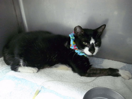 主題: 被車撞傷休克的小賓 申請者姓名: 陳世芬 花色: 申請日期: 2012-11-07 03:26:16 申請者部落格: http://tw.myblog.yahoo.com/ni-blackcat 申請者臉書網址: http://www.facebook.com/fandy.chen 所在縣市/合作醫院: 高雄市/回生動物醫院 治療費用: 18180元 需求人數: 20人 已結案 (2013-06-27 13:54:12) 報名人員: K(已付款)、Ou Han(已付款)、藏心(已付款)、Fandy(已付款)、豆漿(已付款)、WINGS(已付款)、WINGS(已付款)、朱先生(Fandy代捐)(已付款)、牛媽(Fandy代捐)(已付款)、小意(Fandy代捐)(已付款)、寶媽小T(代替牛媽捐款)(已付款)、由紀子(Fandy代捐)(已付款)、Doris Lee(已付款)、匡小姐(已付款)、匡小姐(已付款)、匡小姐(已付款)、匡小姐(已付款)、Han(Fandy代捐)(已付款)、dplantis(已付款)、協會代皮媽小鋪報名(已付款)、 候補人員: 動物病情說明: 小賓是在高雄前鎮市場的TNR貓咪,疑似被車撞傷,嚴重內傷,出現休克甚至沒有呼吸,緊急送醫,狀態危險差點沒命,住在氧氣室用純氧治療。
