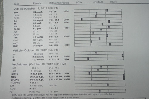 醫院檢查有血胸,抽出血水,血液檢查是敗血症、白血球過高、腎臟指數過高、血鉀離過高、血氯離子過低、有貧血、脫水現象、肺部的囉音很重、有換氣不足的現象。
