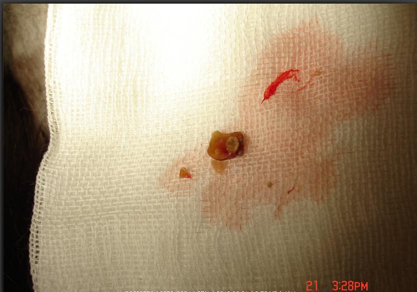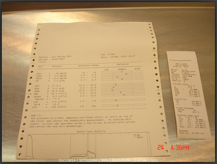 3/5 發現貓咪排血尿和血塊. 醫生先用藥物內科治療. 幾天下來情況仍有血尿. 3/10醫生觸診發現貓咪腰部疼痛懷疑可能有問題. 所以進一步檢查,拍X光後,果然貓咪左右二顆腎臟裡都有結石. 然後作了尿檢,血檢及超音波. 以X光和超音波判斷. 二邊結石都滿大顆的, 尤其是右邊. 醫生確診後建議開刀取結石. 由於不能同時2顆腎臟一起開刀取結石. 故先開刀取出右邊腎臟結石. 等貓咪體力恢復及術後狀況良好,再評估開刀取出左邊腎臟裡的結石. 目前已手術取出右邊腎臟內結石. 術後恢復良好.