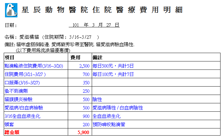 經過5天點滴輸液治療, 橘貓體力恢復. 食慾也很好. 然後再調養1週後, 昨天已野放原處. 愛媽會定時餵養. 申請醫助費用總共5900元.