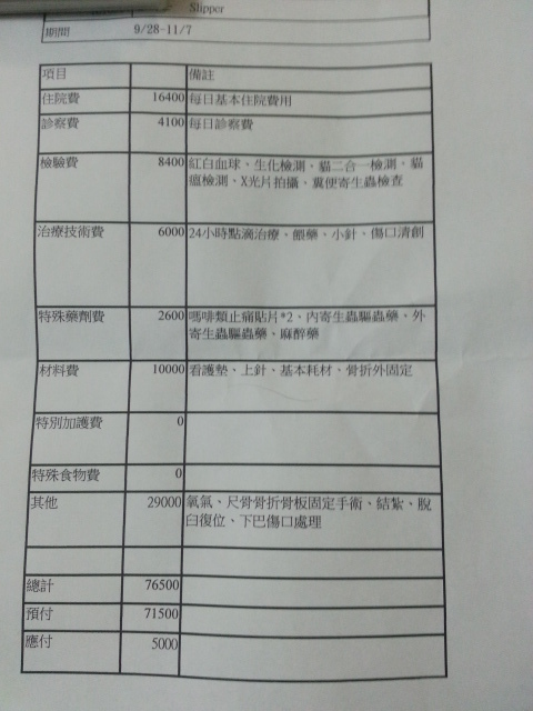 由於Slipper傷勢嚴重,住院與手術費用較高,