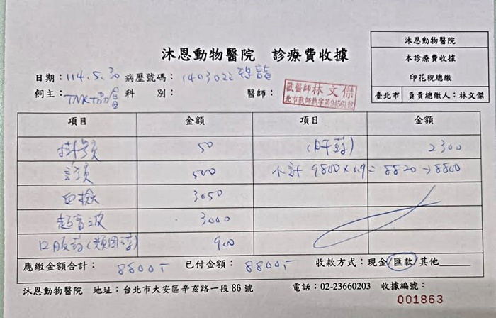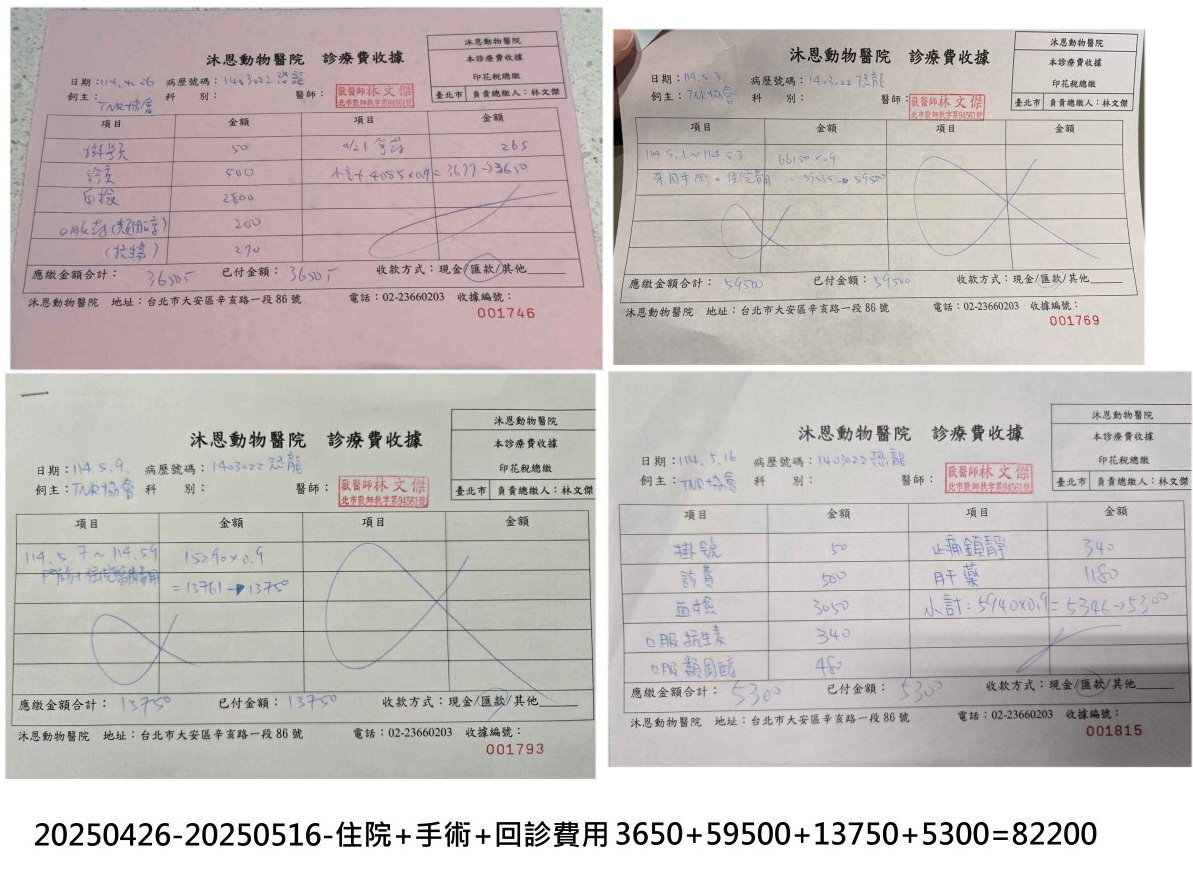 手術當天先進行牙齒的X光檢查,發現有8顆牙根仍存在,因此進行拔除手術,過程順利。但在5/3血檢發現紅血球從原先27.3%急降到9.5%,肝炎指數爆增到3399,恐龍的身體已呈現虛弱無力,沒有食慾吃飯。沐恩為了釐清原因,緊急為恐龍進行腹腔超音波檢查,發現腹腔有水泡般空洞的異常畫面,疑似腫瘤破裂,當下緊急輸血30cc,但紅血球指數仍未見改善,因此當天晚上9點後緊急轉送往24小時的動物醫院照護。動物近況說明: 5/3~5/7在伊甸園動物醫院治療後血檢各項指數已趨穩定,由於5/6恐龍有發燒至39.9,為了保險起見,5/7辦理出院後直接回到沐恩辦理住院觀察,5/9帶回家安置一週後於5/16回診,由於肝發炎指數仍超出正常值以及腎功能欠佳,除了抗生素及類固醇持續服用外,加入肝藥、止痛鎮靜及皮下輸液。預計安置2週後於5/30再回診,全面評估血檢及身體狀況後確認是否針對腹腔疑似腫瘤的問題進行麻醉採樣送檢,待追蹤。