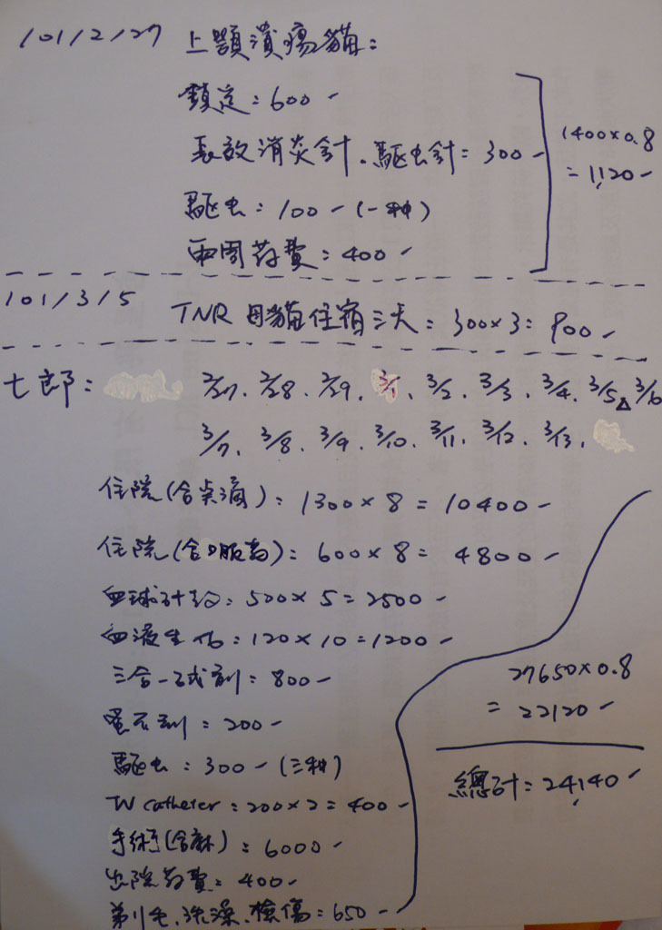 主題: 敗血症_七郎 申請者姓名: 陳曉霏 花色: 申請日期: 2012-03-31 20:46:47 申請者部落格: 申請者臉書網址: http://www.facebook.com/media/set/?set=a.394809483867448.107434.100000152000225&type=3 所在縣市/合作醫院: 台北市/長沁動物醫院 治療費用: 24140元 需求人數: 30人 已結案 (2012-04-24 17:54:08) 報名人員: camelki(已付款)、timel0607(已付款)、Gini Lee(已付款)、Jennifer Hu(已付款)、Queenie(已付款)、Dorothy Wang(已付款)、喵喵(已付款)、GiMi Li(已付款)、橘姆(已付款)、philip(已付款)、Yumi Nico(已付款)、Bonnie Liu(已付款)、Nico Lin(已付款)、Tresia Wu(已付款)、Joanne Chen(已付款)、juno(已付款)、juno(已付款)、A-mi Chan(已付款)、Amber Chu(已付款)、Danno Lin(已付款)、小嘟(已付款)、林郁蓉(已付款)、蕭泰咪(已付款)、Maggie Kuai(已付款)、Ku-ai Gina Chen(已付款)、Kaoru Chen(已付款)、Choco Chen(已付款)、連大玲(已付款)、sally(已付款)、sally(已付款)、 候補人員: 動物病情說明: 目前已經出院 隔離安護中~