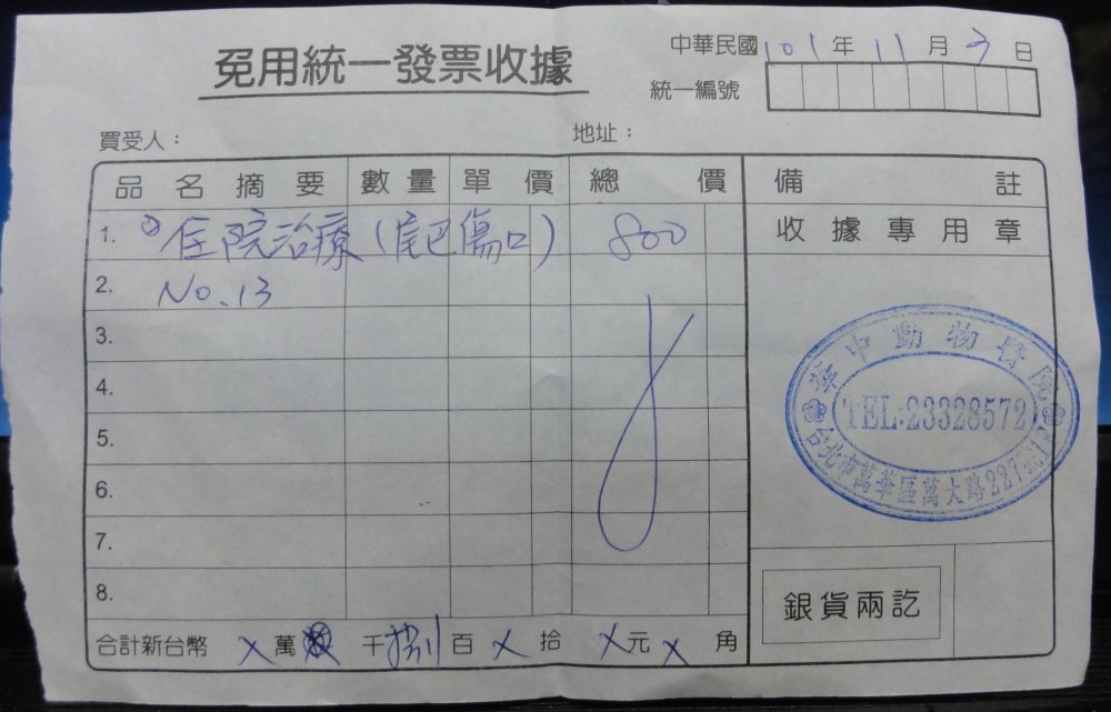 二隻貓在結紮手術後只做簡單治療,一隻費用為700元,一隻為800元,二隻合計共1500元。