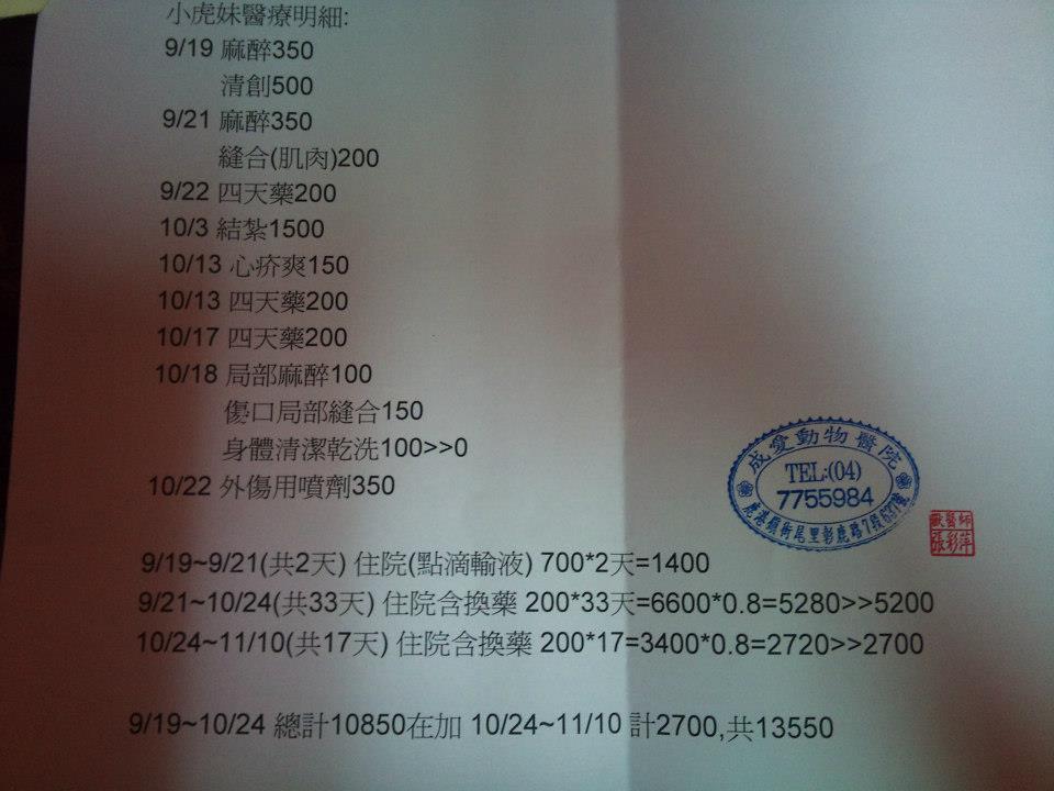主題: 左後腿受傷虎斑妹 申請者姓名: Anna Wang 花色: 申請日期: 2012-11-12 00:13:14 申請者部落格: 申請者臉書網址: 所在縣市/合作醫院: 彰化縣/成愛動物醫院 治療費用: 13550元 需求人數: 15人 已結案 (2013-06-27 14:00:13) 報名人員: 馬豆漿(已付款)、kelly(已付款)、蕭雅倩(已付款)、Mia Yu(已付款)、Doris Lee(已付款)、Sky(已付款)、Sky(已付款)、Sky(已付款)、Sky(已付款)、Sky(已付款)、Sky(已付款)、Sky(已付款)、Sky(已付款)、Sky(已付款)、Sky(已付款)、 候補人員: 動物病情說明: 9月中旬發現後腿有大片傷口的小貓,於9月19日誘捕成功後立即送醫,清創包紮完後,小妹有點過瘦, 有脫水現象,給予點滴輸液。