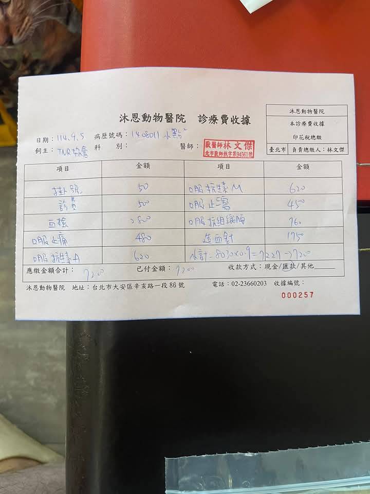近期於2025年9月5日回診檢查,紅血球指數已下降,腎指數也正常,嘴巴腫大部分也逐漸消腫,目前精神食慾都正常,也逐漸適應新環境。本筆醫助為2025年9月5日於沐恩醫院的費用,包含血檢及各項用藥。