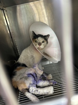 到醫院檢查驗血拍X光,左後腿關節骨折或脫臼、傷口很深,下半身有大面積挫傷、尾巴也有個深及見骨的傷口,血檢發現股指數破表、體溫36.5度偏低,先住院穩定生命跡象、清創、避免感染,骨頭的骨折或脫臼再觀察是否需要開刀
