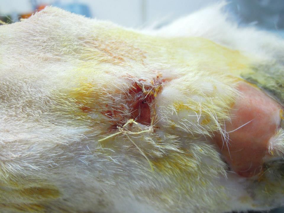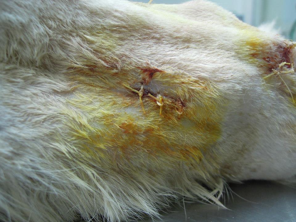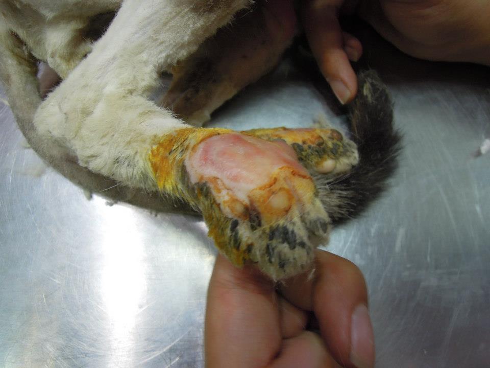 看傷口的傷勢應該是被狗狗咬傷的~很深膿很多