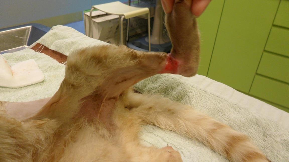 已掙脫但腳腫大有外傷,用三隻腳走路,