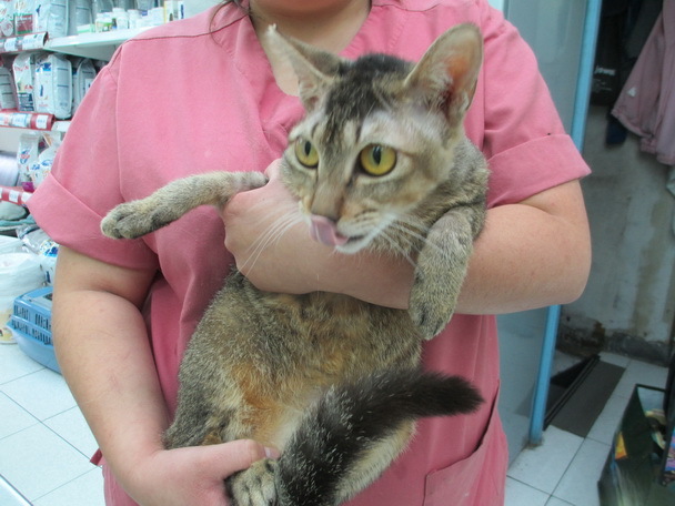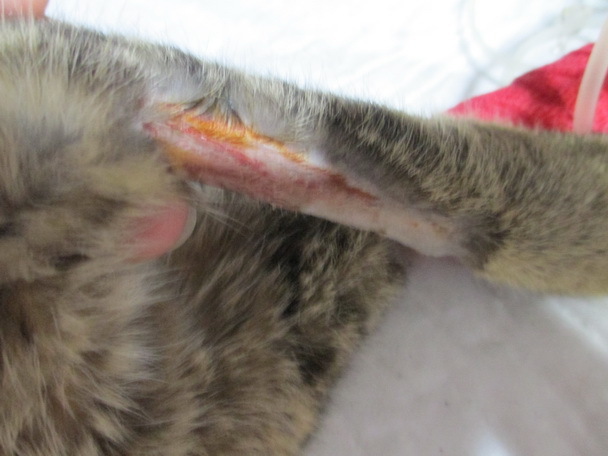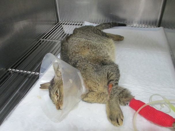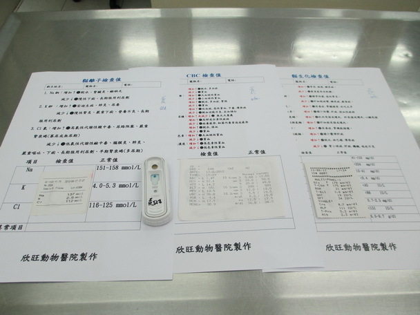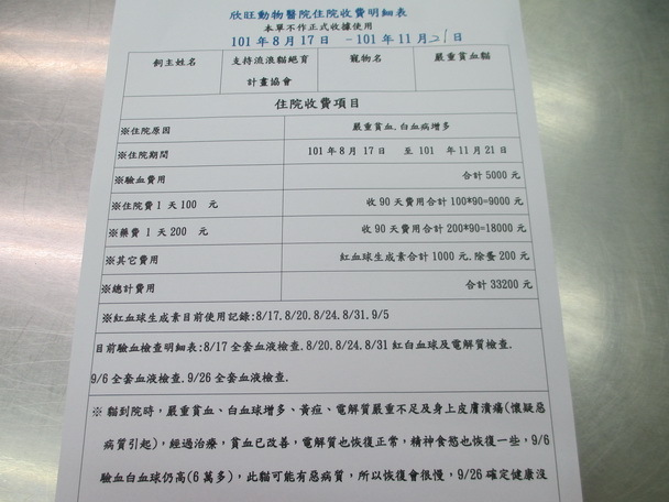 101/8/17貓到院時,嚴重貧血、白血球增多、黃疸、電解質嚴重不足及身上皮膚潰瘍(懷疑惡病質引起),經過治療,貧血已改善,電解質也恢復正常,精神食慾也恢復一些,9/6驗血白血球仍高(6萬多),此貓可能有惡病質,所以恢復會很慢,9/26確定健康沒問題,就處理皮膚潰瘍,目前傷口已穩定,體重也恢復到2.8公斤.所以志工於11/21帶回照顧