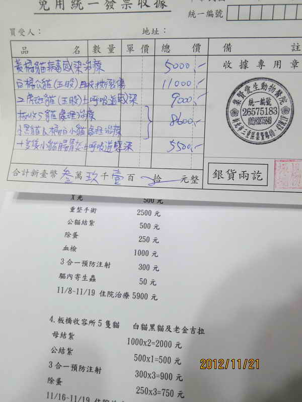 主題: 11月份16姨的中途大小貓總醫療費 申請者姓名: 楊雅筑 花色: 申請日期: 2012-11-21 16:58:50 申請者部落格: 申請者臉書網址: 所在縣市/合作醫院: 新北市/集賢愛生 治療費用: 39100元 需求人數: 42人 已結案 (2013-06-27 14:04:54) 報名人員: 比比(已付款)、Larry Hey(已付款)、Larry Hey(已付款)、Ian Tw(已付款)、Vincent Ho(已付款)、Ian Tw(已付款)、Peggy Lin(已付款)、connie242(已付款)、Claus(已付款)、Claus(已付款)、Claus(已付款)、Claus(已付款)、Claus(已付款)、Rebecca Wu(已付款)、娜娜(已付款)、Amy Wang(已付款)、yoyo(已付款)、hana(已付款)、黃小蒨(已付款)、吳亭亭(已付款)、龍昊天(已付款)、龍昊天(已付款)、王六(已付款)、陳瑩芝(已付款)、怡文(已付款)、bernice liao(已付款)、Weili Chang(已付款)、豆漿(已付款)、美桂柔姍(已付款)、火鳳貍(已付款)、王蓓莉、Bubu Wang(已付款)、Jau Shiang Hsieh(已付款)、Jau Shiang Hsieh(已付款)、lingyun(已付款)、Dana Hsu(已付款)、A-mi Chan(已付款)、Monica Hu、Sky(已付款)、Sky(已付款)、Sky(已付款)、Sky(已付款)、Kao Cathy(已付款)、Lana Hung(已付款)、 候補人員: Bella、 動物病情說明: 11月份因為接了二個的收容所的傷病貓出來