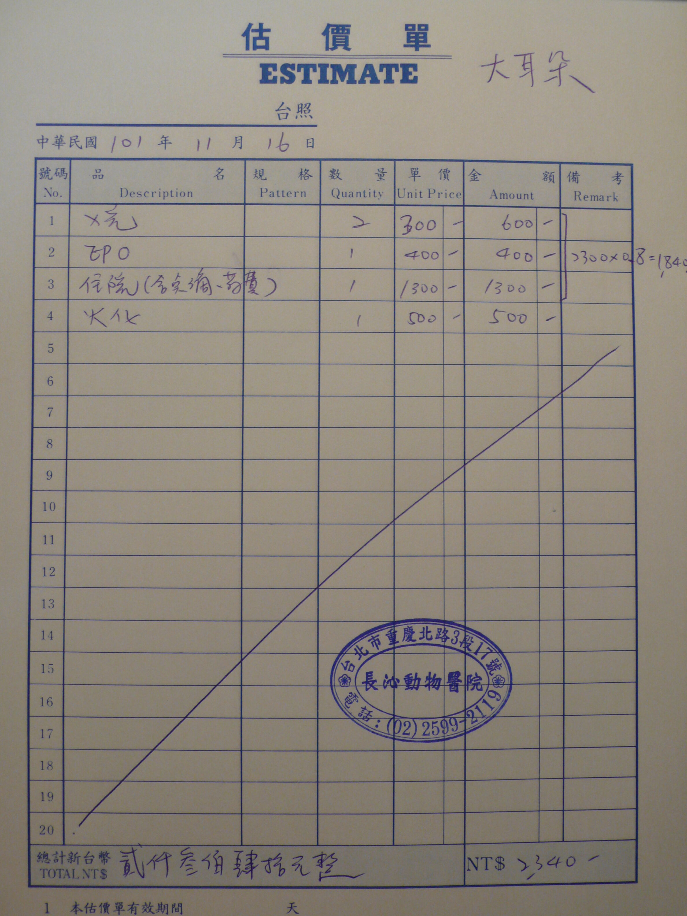 主題: 路倒求救貓 申請者姓名: 陳曉霏 花色: 申請日期: 2012-11-23 04:42:29 申請者部落格: 申請者臉書網址: http://www.facebook.com/xiaofeic 所在縣市/合作醫院: 台北市/長沁動物醫院 治療費用: 2340元 需求人數: 10人 已結案 (2013-06-27 14:11:40) 報名人員: 陳彥肇(已付款)、咪嚕、Ekim Lu(已付款)、imlosting(已付款)、imlosting(已付款)、yaya(已付款)、yaya(已付款)、愛米粒(已付款)、小可(已付款)、小可(已付款)、美珍沈(已付款)、 候補人員: 動物病情說明: 大耳朵 是平常在餵養的貓