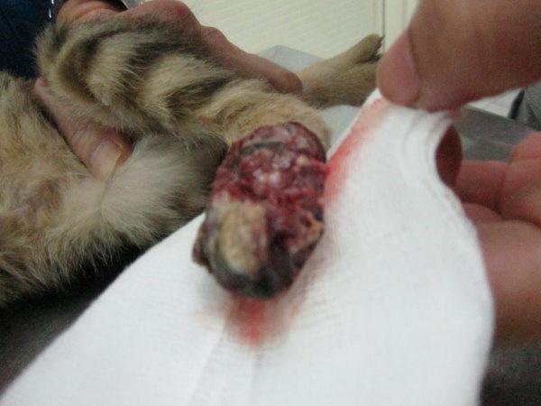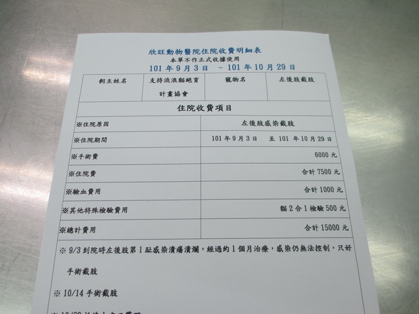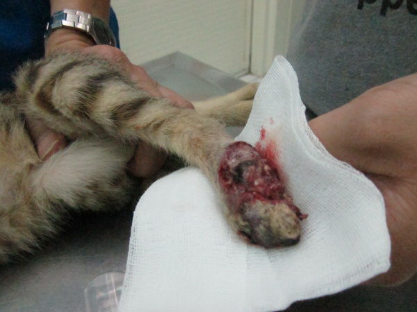 主題: 頂樓母帶4子其中1子腳傷嚴重 申請者姓名: 練素鳳 花色: 申請日期: 2012-11-24 09:47:59 申請者部落格: 申請者臉書網址: 所在縣市/合作醫院: 台北市/欣旺動物醫院 治療費用: 15000元 需求人數: 16人 已結案 (2013-06-27 14:10:51) 報名人員: chiawei(已付款)、William Chang(已付款)、Anita Lu(已付款)、蔡雅芸(已付款)、Christina Chiang(已付款)、杜杜(已付款)、momo(已付款)、Huai-chie Chiue(已付款)、chiawei(已付款)、徐阿悟(已付款)、Sky(已付款)、Sky(已付款)、Sky(已付款)、Sky(已付款)、Sky(已付款)、Sky(已付款)、 候補人員: 動物病情說明: 住在永吉路黃先生的愛媽通報,四樓頂樓有一隻媽媽和4隻小貓.媽媽成功誘捕帶至醫院結紮.發現4隻小貓其中有1隻小貓的腳上有傷口一並帶回檢查.就醫之後.發現腳趾變黑壞死一開始用抗生素治療.希望能順利治療成功.畢竟小貓少了一隻腿是會很辛苦但經過一段時間的治療情況並沒起色.傷口一直沒有好轉且惡化.在最不得已的情況下選擇了截隻手術.目前小貓已康復.由志工帶回照顧.目前正在找愛牠的主人中.