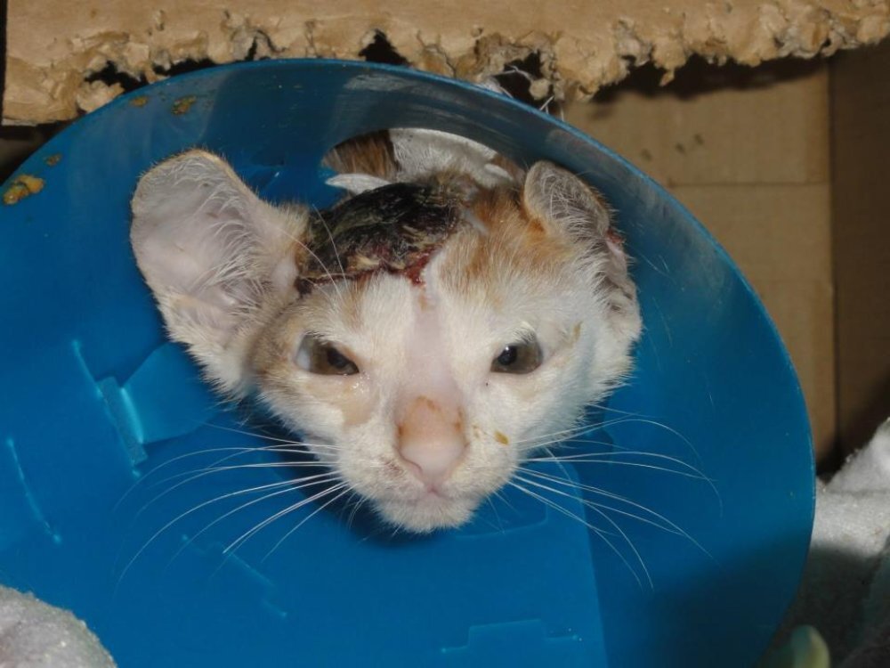 到第三天時 鄰居用網子把牠撈起 打電話給我 那時我正在別處忙著抓貓沒接到電話 於是她把牠放在旁邊自來水廠營運處的停車場 (這當下頭和臉是正常的)