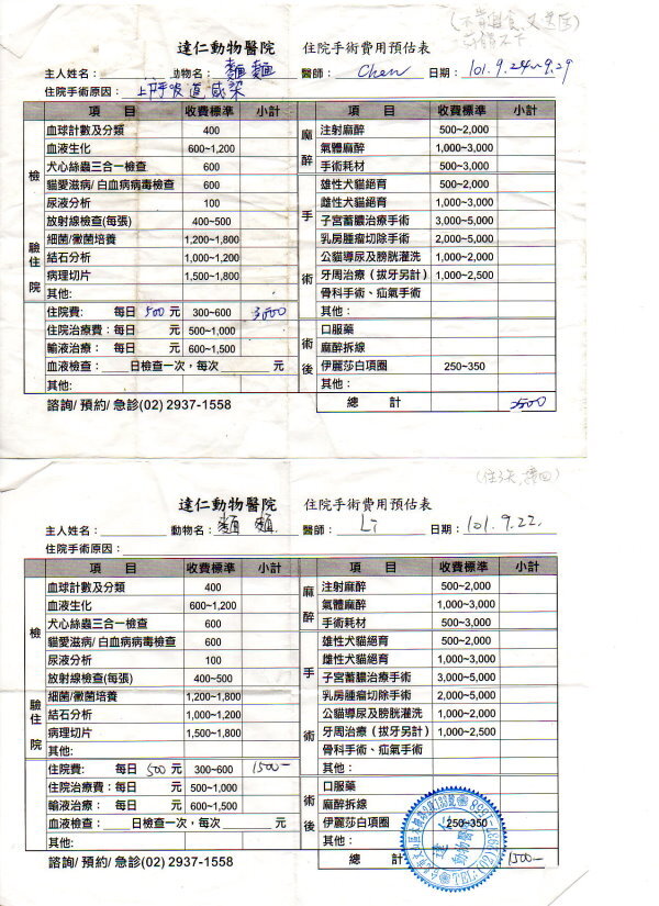 主題: 受困夾層五天的麵麵 申請者姓名: 蔡葦澄 花色: 申請日期: 2012-12-05 15:30:02 申請者部落格: 申請者臉書網址: 所在縣市/合作醫院: 台北市/達仁動物醫院 治療費用: 4000元 需求人數: 9人 已結案 (2013-02-23 14:42:59) 報名人員: 柯小芳(已付款)、Edwin(已付款)、Sky(已付款)、Sky(已付款)、Sky(已付款)、Sky(已付款)、Sky(已付款)、Sky(已付款)、Sky(已付款)、 候補人員: 動物病情說明: 忠孝東路張媽媽通報受困五天的貓咪,脫困結紮之後,因該夾層不適合回置,又擔心貓從未在平面生活,不會過馬路閃車躲狗,決定先安置至中途家,等適應環境將進行野放,結紮出院後第三天,貓咪開始不吃東西,看起來有鼻塞的現象,費了一番功夫,終於把貓趕至提籃內帶去就醫,因體重下降迅速,醫師評估需住院上點滴,治療三天後狀況改善,先出院持續投藥,兩天後貓咪又開始不吃,也無法投藥,又送回住院打點滴注射抗生素,跟醫師討論有可能這隻貓長期躲在夾層內...沒有接觸到外面,所以外面的氣候溫度變化他不能適應,治療快兩個月才完全康復,住院的醫療費用還請各位幫幫忙。