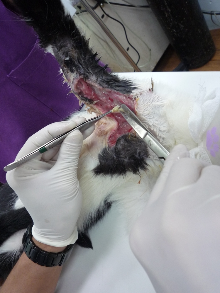 轉院後 醫生細心的幫小黑白處理傷口