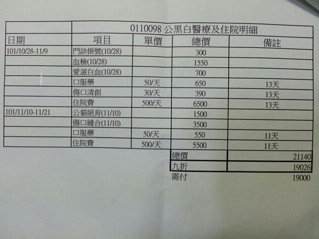 主題: 大面積傷口受困貓 申請者姓名: 陳曉霏 花色: 申請日期: 2012-12-05 20:35:51 申請者部落格: 申請者臉書網址: http://www.facebook.com/xiaofeic 所在縣市/合作醫院: 台北市/其他院所醫助專案(醫院請先MAIL溝通) 治療費用: 19000元 需求人數: 21人 已結案 (2013-02-23 14:42:32) 報名人員: Sky(已付款)、Sky(已付款)、Sky(已付款)、Sky(已付款)、Sky(已付款)、Sky(已付款)、Sky(已付款)、Sky(已付款)、Sky(已付款)、Sky(已付款)、Sky(已付款)、Sky(已付款)、Sky(已付款)、Sky(已付款)、Sky(已付款)、Sky(已付款)、Sky(已付款)、Sky(已付款)、Sky(已付款)、Sky(已付款)、Sky(已付款)、 候補人員: 動物病情說明: 小黑白 是一個熱心網友長期在餵養的街貓