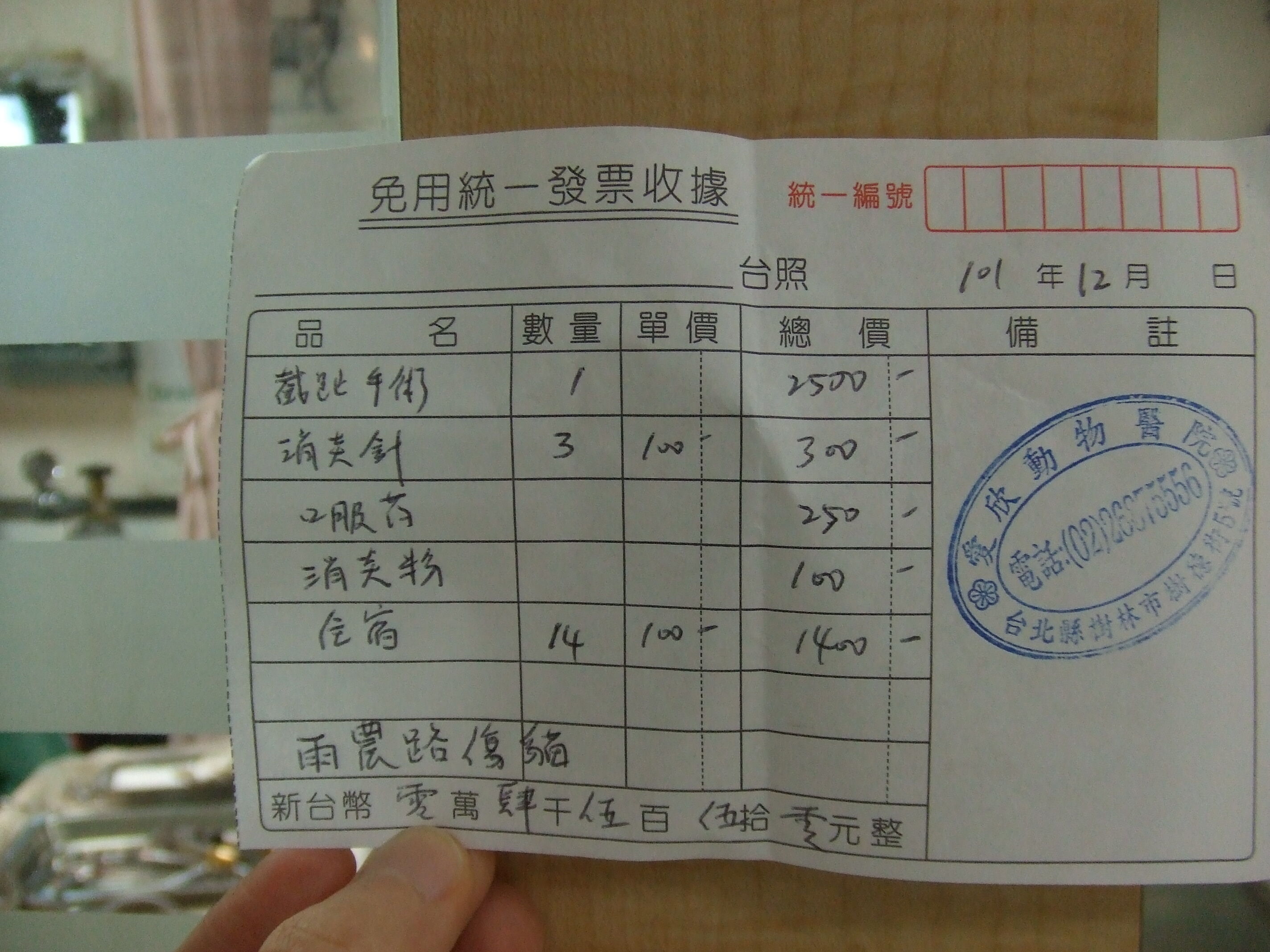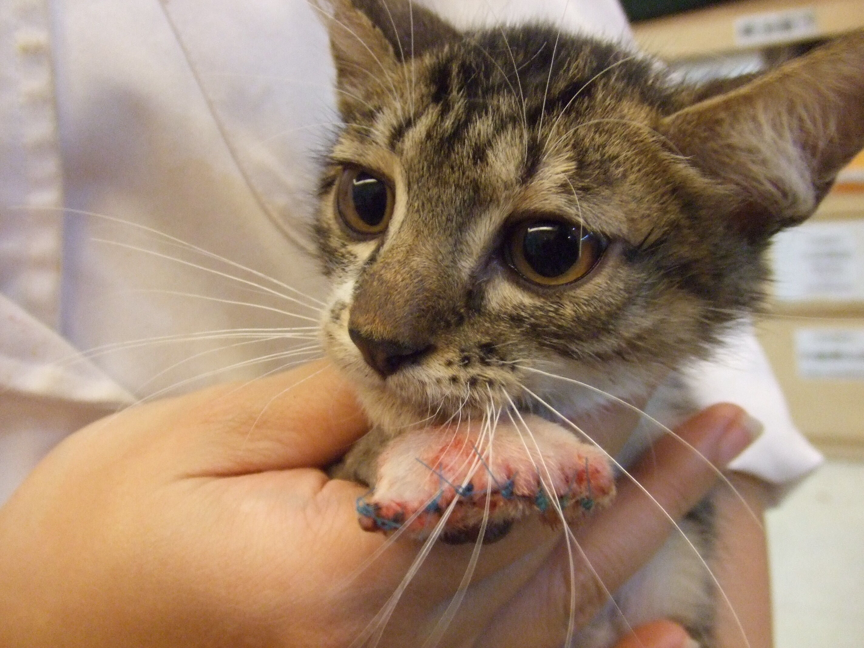 主題: 雨農路腳指受傷的貓 申請者姓名: 廖惠玲 花色: 申請日期: 2012-12-07 20:25:42 申請者部落格: 申請者臉書網址: 所在縣市/合作醫院: 新北市/愛欣動物醫院 治療費用: 4550元 需求人數: 11人 已結案 (2013-02-23 14:41:32) 報名人員: 奶茶喵嗚(已付款)、惠青(已付款)、sttmis(已付款)、蔡雅芸(已付款)、鄧莉臻(已付款)、王駝(已付款)、春貴(已付款)、鯉魚(已付款)、鐵鎚、鐵鎚(已付款)、Miho Huang(已付款)、vanessa(已付款)、 候補人員: 陳宏林、 動物病情說明: 此貓腳趾受傷 誘捕後 手術截趾並住院治療