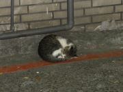 麼,像是等某人出現,來餵他,累了就直接在巷口睡覺,車輛來來往往,他也毫