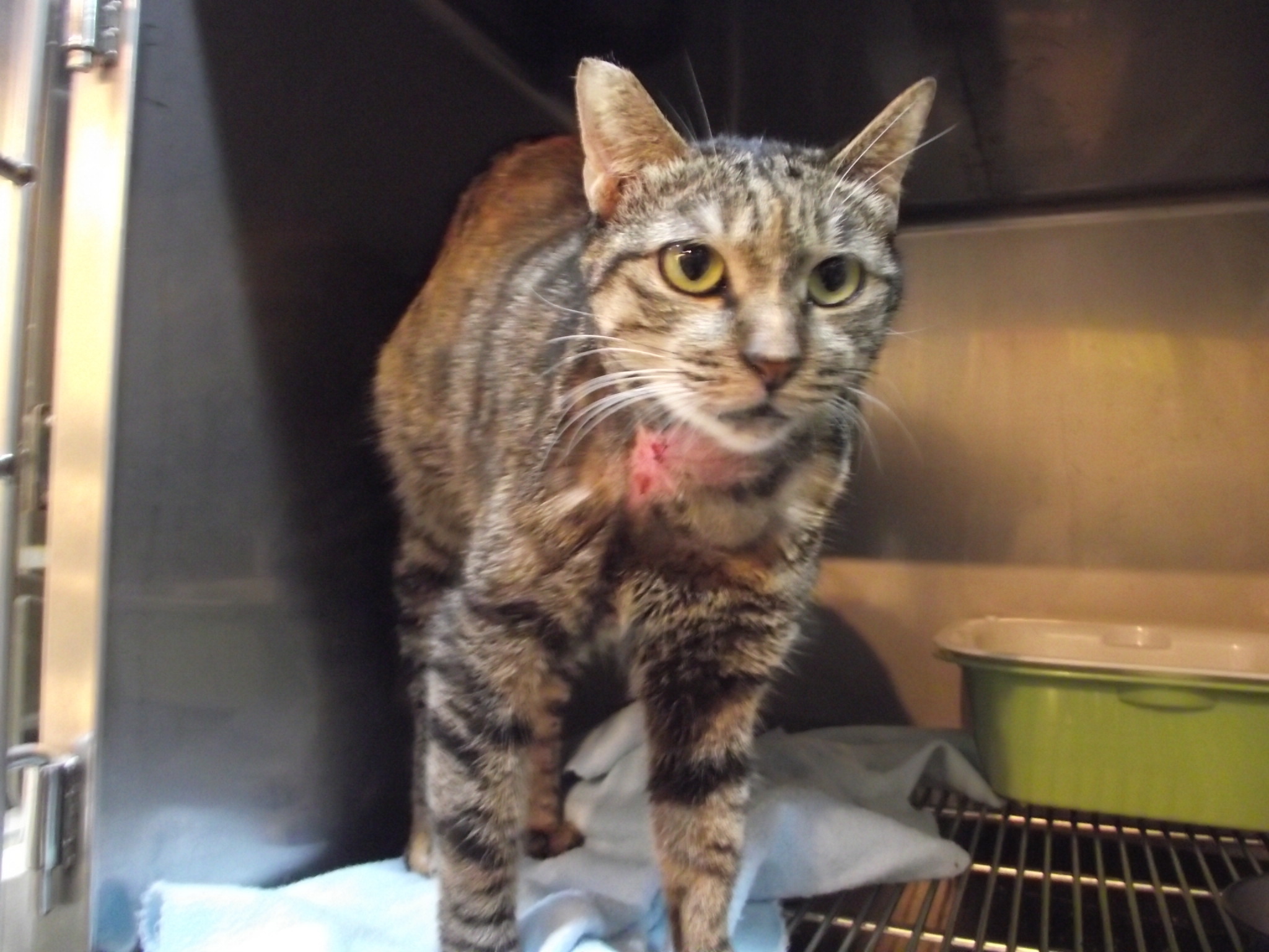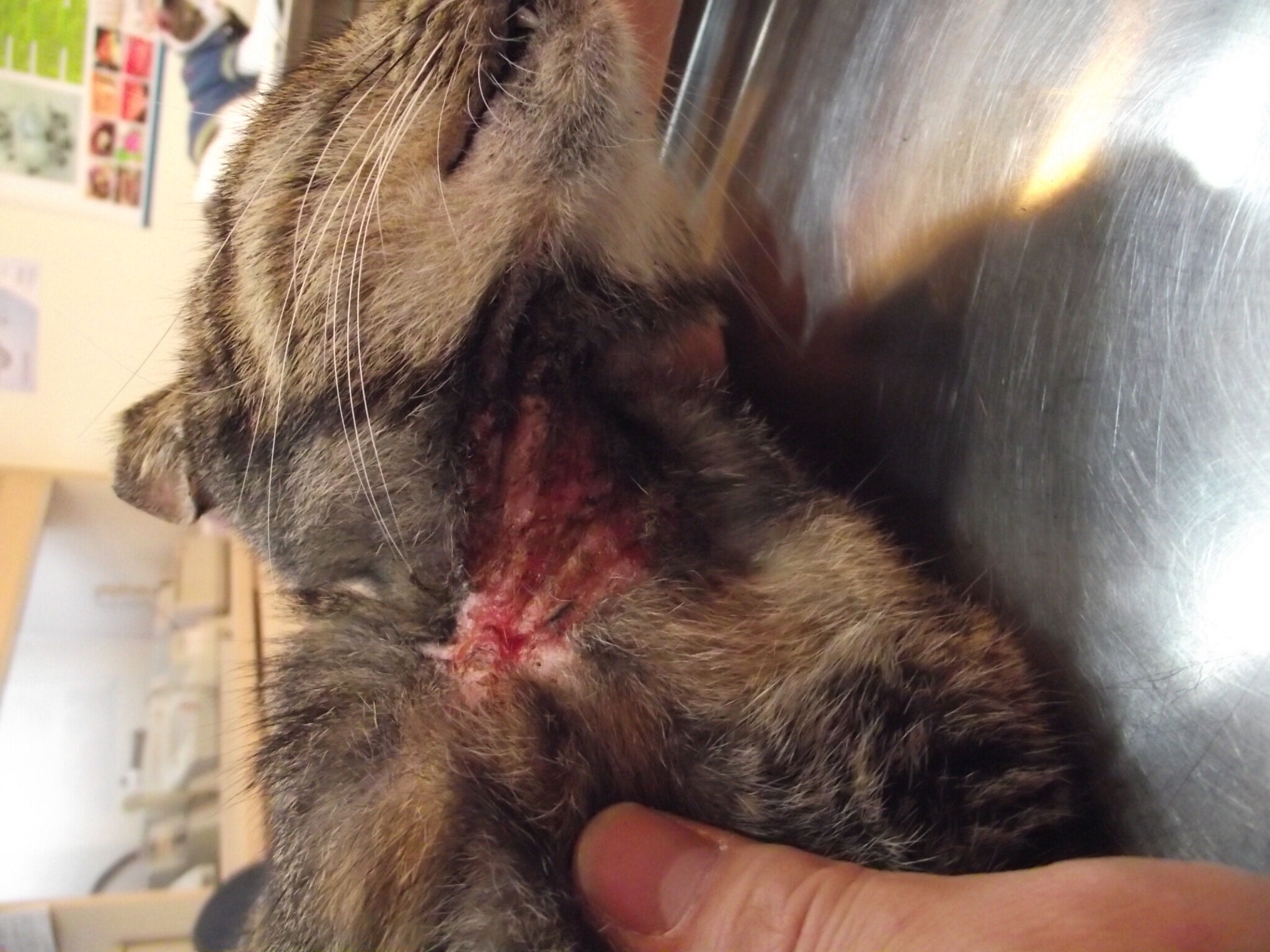 要去別處誘捕街貓結紮時,意外撞見這隻已經結好紮的虎斑竟脖子下方受傷流血了