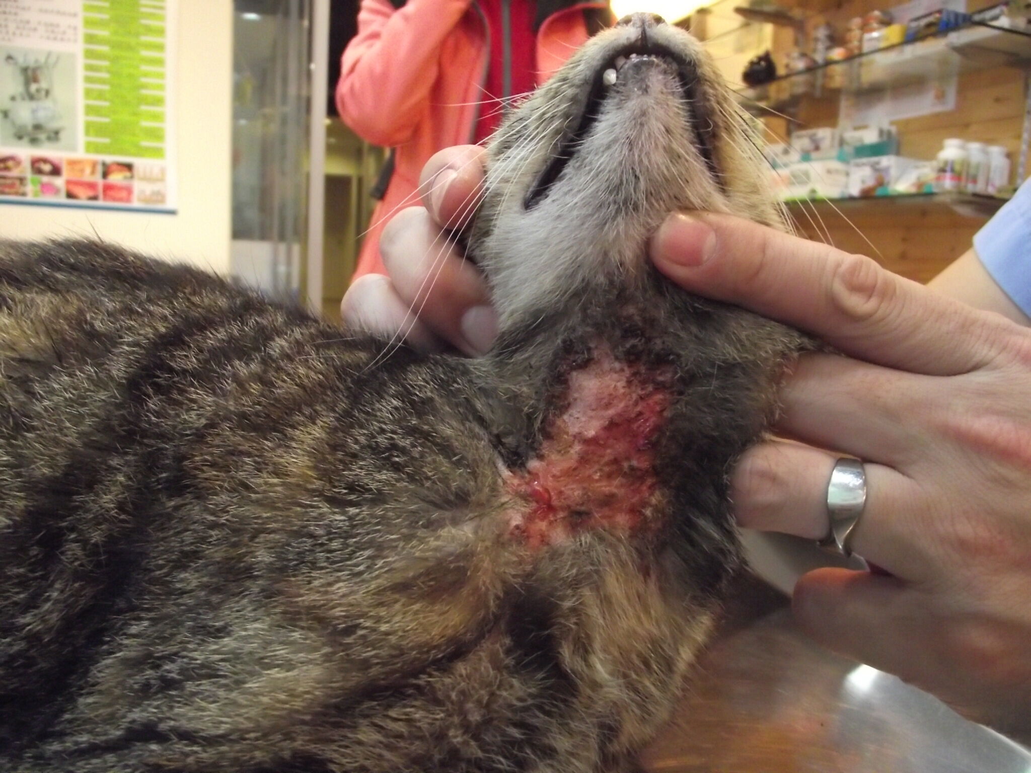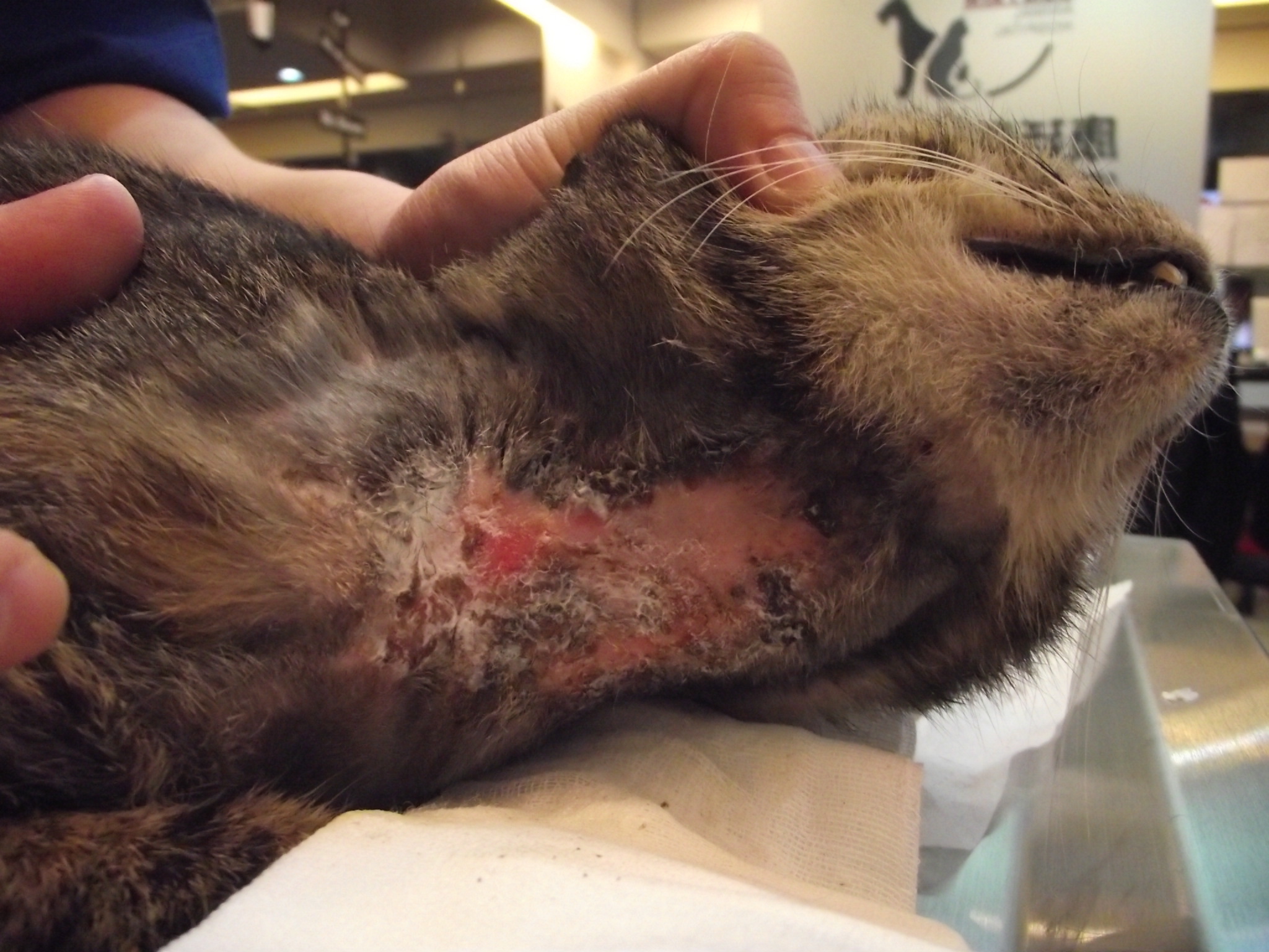 目前正在我這邊安置中,傷口已經結痂,但是還需要擦藥,至於大面積沒毛處很有可能不會再長毛了