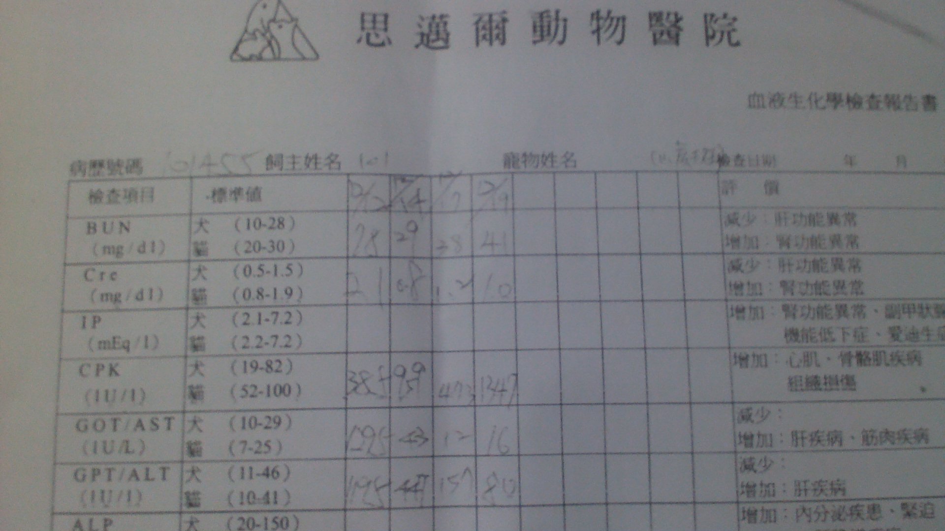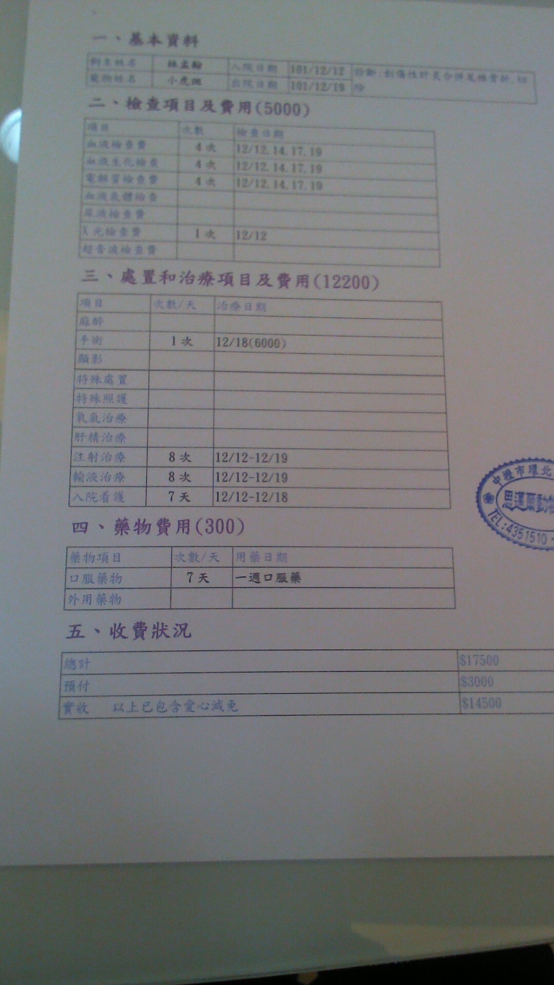 主題: 尾巴爛掉且肝指數超高的小虎斑 申請者姓名: 林孟翰 花色: 申請日期: 2012-12-19 21:10:53 申請者部落格: 申請者臉書網址: https://www.facebook.com/menghan.lin2 所在縣市/合作醫院: 桃園縣/思邁爾動物醫院 治療費用: 14500元 需求人數: 16人 已結案 (2013-06-27 14:12:50) 報名人員: momo(已付款)、Agatha、Agatha、小喵、Shan Chou(已付款)、Shan Chou(已付款)、Zoe Chen(已付款)、SHIN HUI(已付款)、Joanne Chang(已付款)、諸葛龍臣(已付款)、諸葛龍臣、Pac Chien(已付款)、Viviann Chuang(已付款)、euca(已付款)、np0041(已付款)、Rachel Chen(已付款)、chiawei(已付款)、Freesia Tsai(已付款)、Shirley Tsai(已付款)、林雅雯(已付款)、 候補人員: 動物病情說明: 在紫雲宮外金陵路車下看到這隻可憐的貓咪,狀況很糟,尾巴爛掉,送醫檢查發現肝指數(GOT GPT)超標 ~