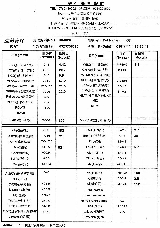 主題: 高鐵附近 躺在車下不動的路倒小貓咪 申請者姓名: 陳露露 花色: 申請日期: 2012-12-22 13:34:39 申請者部落格: 申請者臉書網址: 所在縣市/合作醫院: 高雄市/樂生動物醫院 治療費用: 9900元 需求人數: 11人 已結案 (2013-06-27 14:12:09) 報名人員: Amy(已付款)、Uu、火鳳貍(已付款)、philtery(已付款)、Maureen Huang(已付款)、Lan(已付款)、chiawei(已付款)、Eligh Liu(已付款)、Ou Han(已付款)、吳毓軒(已付款)、philip(已付款)、sharonhuang9(已付款)、 候補人員: 動物病情說明: 平常不會往高鐵那方向去, 剛好那天朋友的關係要趕到高鐵站, 在快到高鐵的路上停紅綠燈時, 突然看到路邊車下有一隻貓一動也不動, 以為貓咪已經往生, 所以幫他收屍到醫院火化, 沒想到貓咪還有一點體溫, 好像還活著, 就趕緊帶附近的合作醫院. 因為還要再趕回高鐵, 所以先拜託醫生趕緊搶救這隻虛弱的貓咪. 醫生說貓咪的身體很虛, 體內有多蟲, 經過差不多一個月的休養, 治療, 貓咪目前已經康復, 但看起來他好乖不太活潑, 可是很親人. 很高興他活下來了.