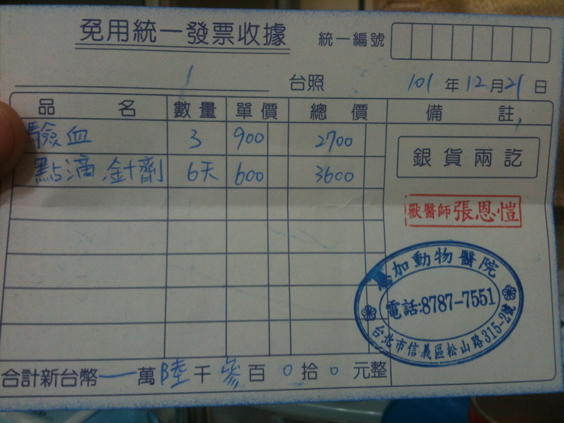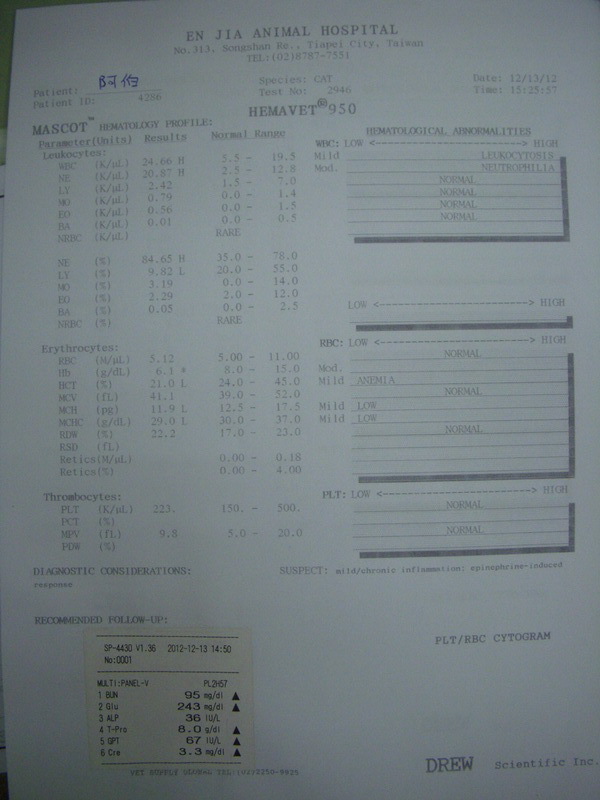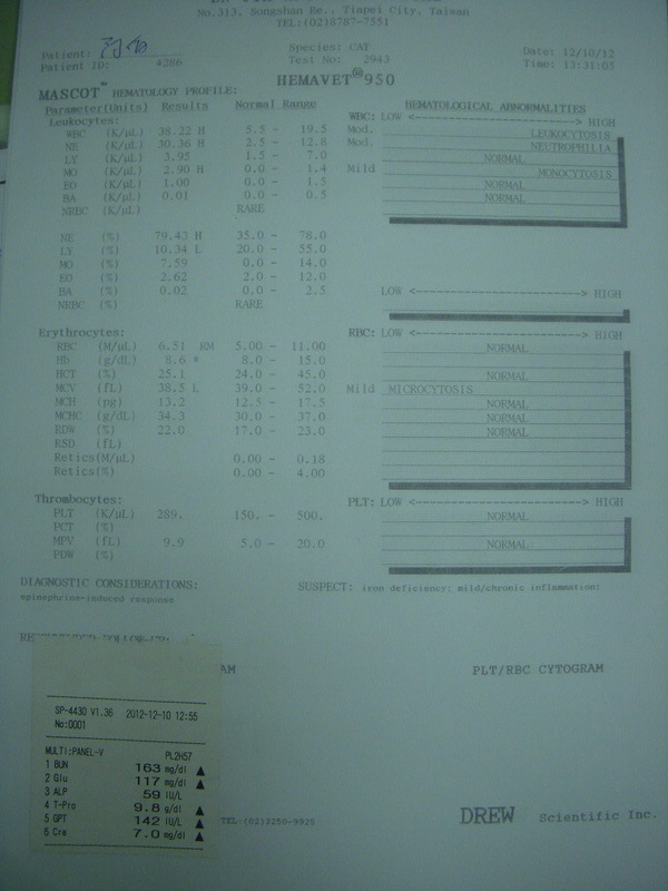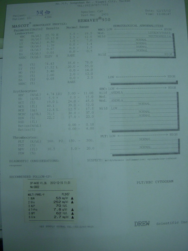主題: 路倒血尿的白底虎斑 申請者姓名: 林素蘭 花色: 申請日期: 2012-12-22 14:51:25 申請者部落格: 申請者臉書網址: 所在縣市/合作醫院: 台北市/恩加動物醫院 治療費用: 3150元 需求人數: 7人 已結案 (2013-08-06 13:46:06) 報名人員: Uu、火鳳貍(已付款)、wanshi-lai(已付款)、徐雅嬪(已付款)、CrystalBall(已付款)、Bubu Wang(已付款)、黃先生、Miko Tseng、許炫宇(已付款)、hero178(已付款)、 候補人員: 動物病情說明: 發現一隻白底虎斑路倒,聯絡送醫後觀察有血尿的狀況,原以為只需要投抗生素治療就好,兩三天未見改善,進一步血檢發現是腎衰竭,上點滴和抗生素治療,現在比較穩定,已帶回照顧,慢性病自費50%的費用,申請醫助3150元,還請各位幫幫忙。