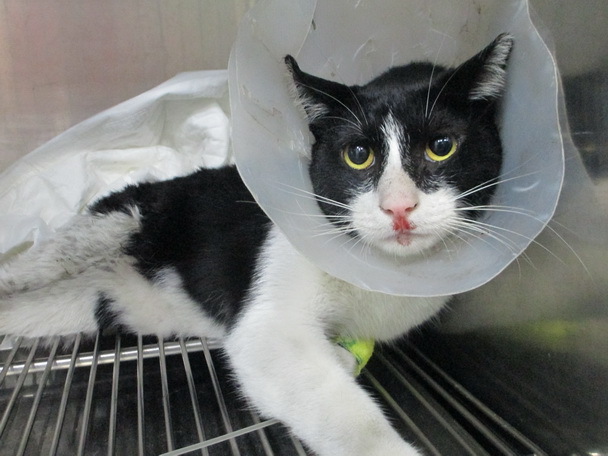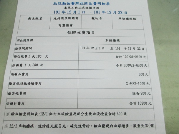 主題: 車禍失溫的黑白貓 申請者姓名: 楊溫蒂 花色: 申請日期: 2012-12-22 18:46:23 申請者部落格: 申請者臉書網址: 所在縣市/合作醫院: 台北市/欣旺動物醫院 治療費用: 10200元 需求人數: 11人 已結案 (2013-08-06 13:45:59) 報名人員: Jill(已付款)、Uu、Jane Chen(已付款)、Clain Lin(已付款)、WeiLin Chen(已付款)、韋恩咖啡、黃立皮(已付款)、sasa(已付款)、Ekim Lu(已付款)、Jess(已付款)、OLivia Lee(已付款)、黃先生、Fubii Su Fubii Su、Mia Wei(已付款)、Mao Guai(已付款)、 候補人員: Alex.Tsai、 動物病情說明: 滷蛋是這隻黑白公貓的名字.牠是前一陣子TNR的貓.平日魯蛋都是在住家對街小吃店附近活動.很少會離開過馬路.12/1早上7點多下樓要去買菜時聽到滷蛋哀號的叫聲.循著叫聲找到滷蛋.發現牠躲在車下.下半身不會動.疑似被車撞.於是趕緊回家拿網子撈.緊急就醫.送醫發現滷蛋下半身癱瘓.體溫35.7.隨時有可能會休克.醫生緊急幫滷蛋保溫上點滴.並照X光.還好滷蛋沒有骨折.但需要一段時間修復......經過3星期治療滷蛋恢復體溫.食慾.但下半身還需要一段時間恢復.目前滷蛋帶回照顧中.