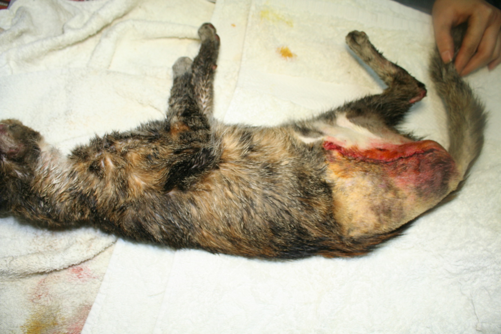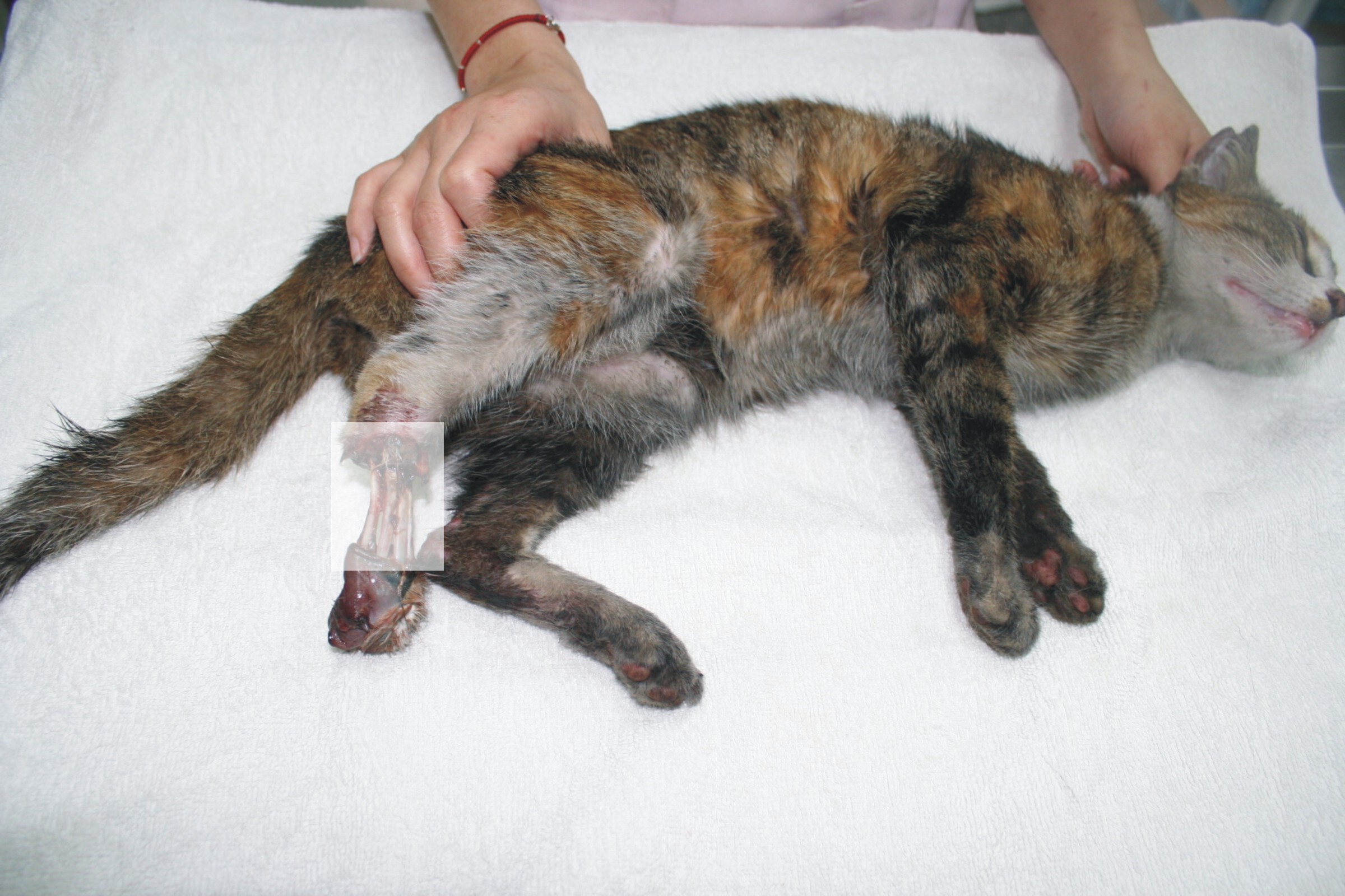 三花貓的右後腿小腿處已完全壞死,所以需要截肢