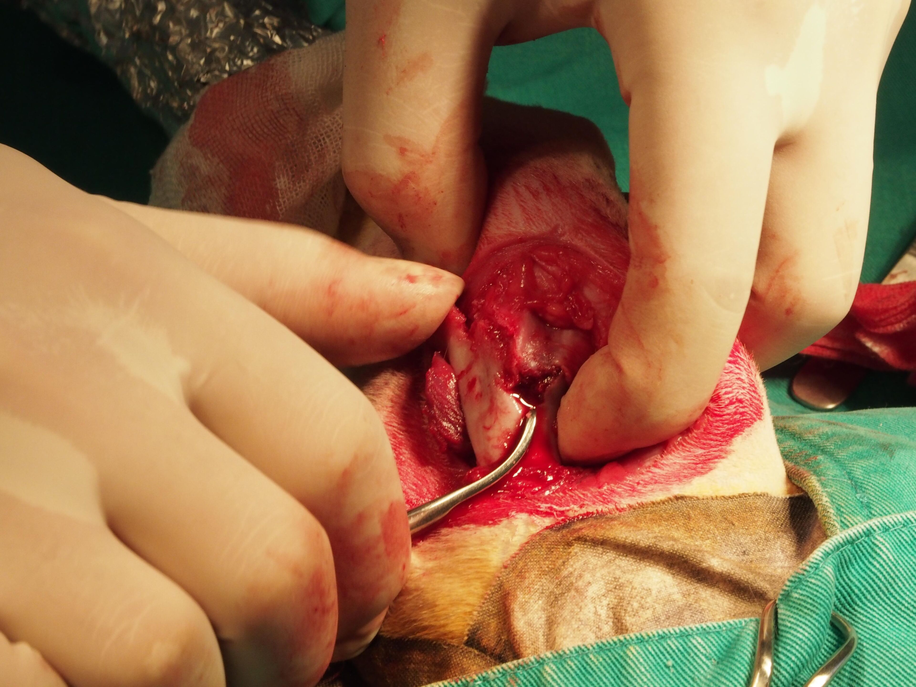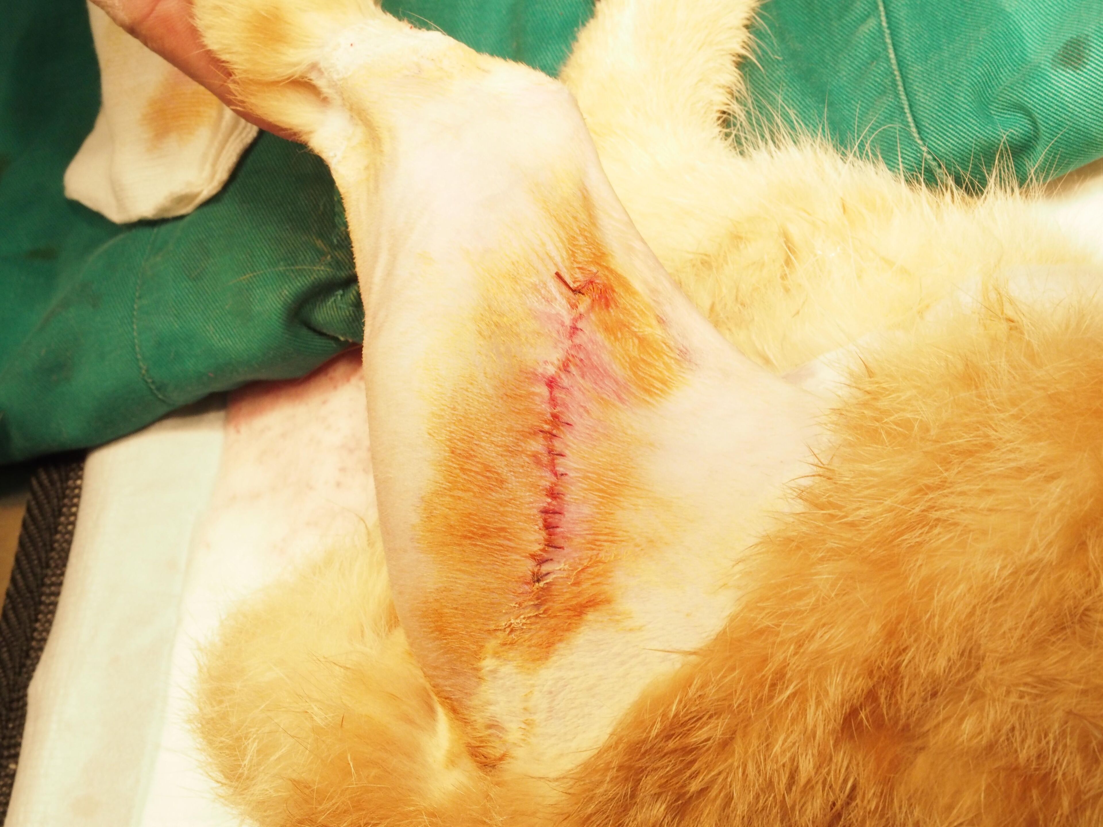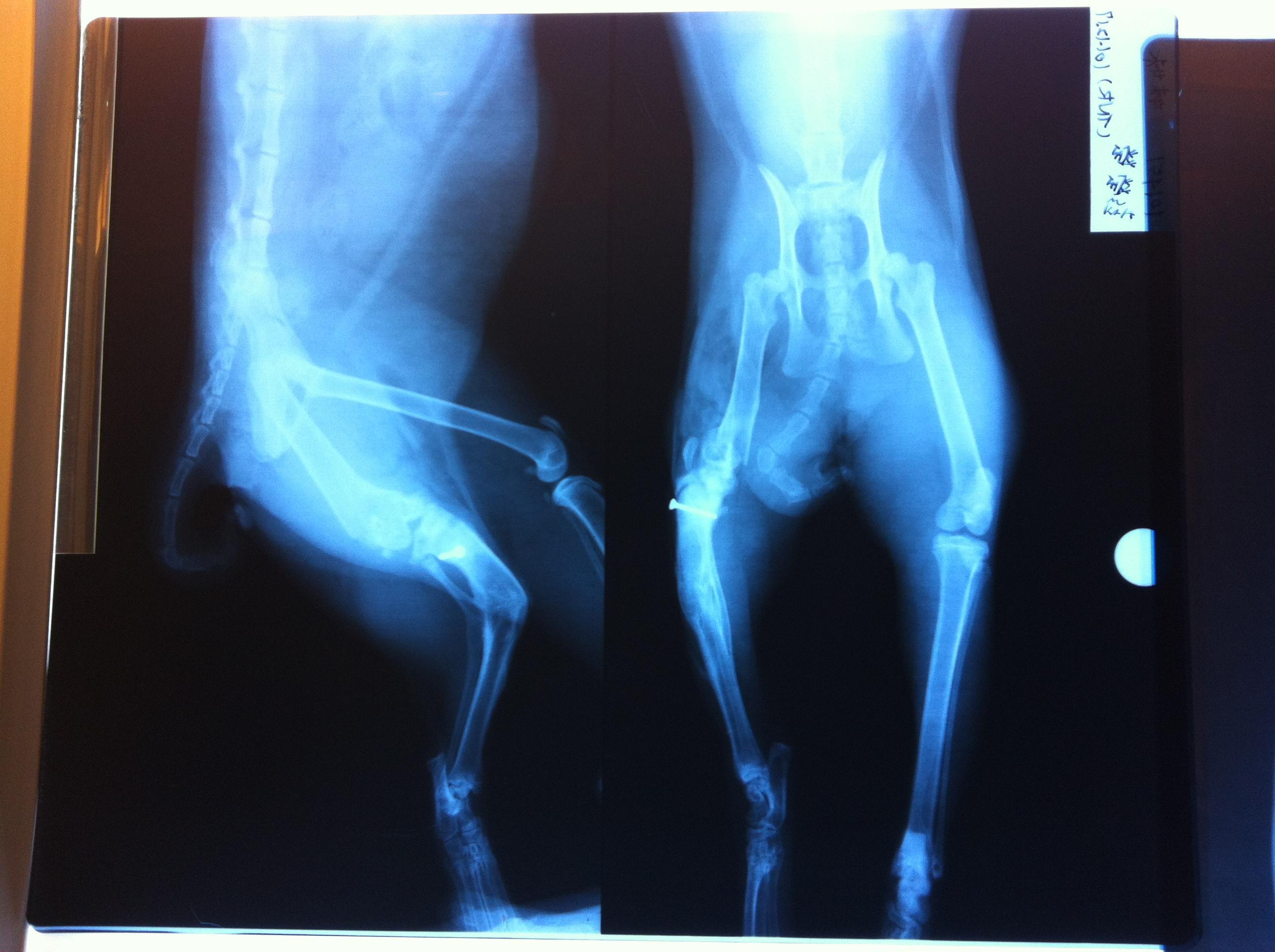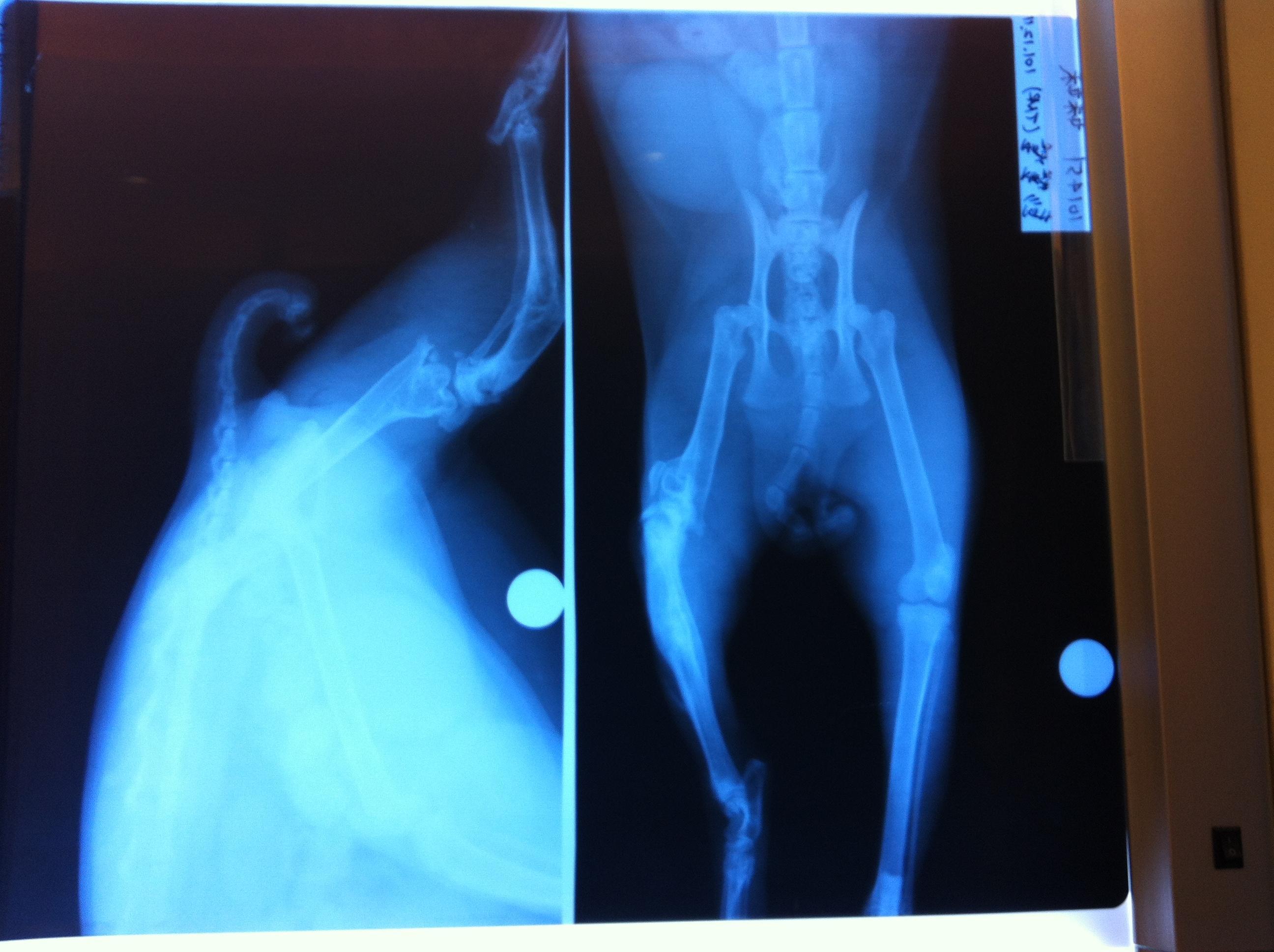 因為她非常膽小怕人,都是等我離開才敢出來吃大家剩下的,所以發現得很晚。等到發現時,她小腿的骨折已經自行接合,但卻是長成歪的,大腿骨則裂成尖刺,刺進她的肉裡,關節也因而裂開脫離,也就是說她每走一歩路就有尖在刺,可憐的孩子就這樣拖著傷腿痛了不知道多少個日子!